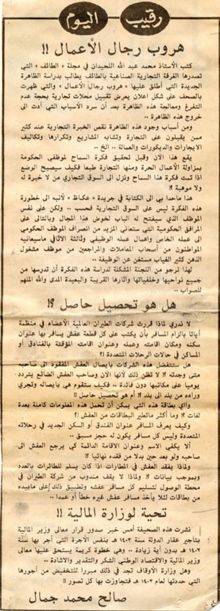 كتب الأستاذ محمد عبد الله اللحيدان في مجلة «الطائف» التي تصدرها الغرفة التجارية الصناعية بالطائف يطالب بدراسة الظاهرة الجديدة التي أطلق عليها «هروب رجال الأعمال» والتي ظهرت بالصحف على شكل إعلان يعرض تقبيل محلات تجارية بحجة عدم التفرغ ومعالجة هذه الظاهرة بعد أن سرد الأسباب التي أدت إلى خروج هذه الظاهرة..