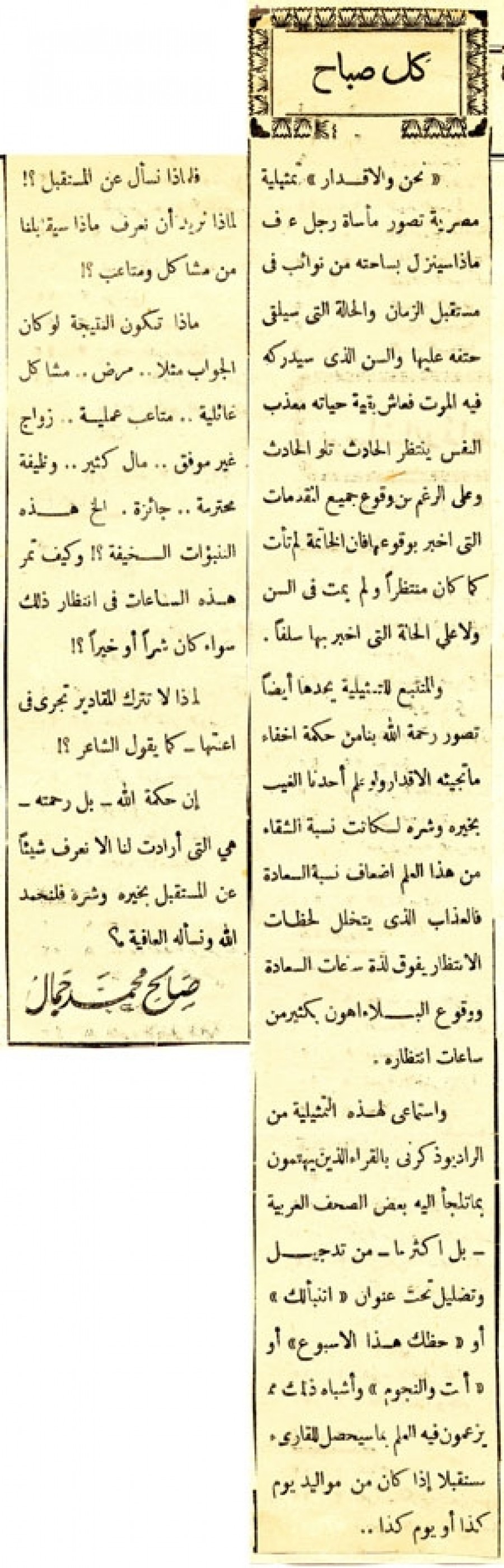 واستماعي لهذه التمثيلية من الراديو ذكرني بالقراء الذين يهتمون بما تلجأ إليه بعض الصحف العربية - بل أكثرها - من تدجيل وتضليل تحت عنوان "أتنبأ لك" أو "حظك هذا الأسبوع" أو "أنت والنجوم" وأشباه ذلك مما يزعمون فيه العلم بما سيحصل للقارئ مستقبلاً إذا كان من مواليد يوم كذا أو كذا.