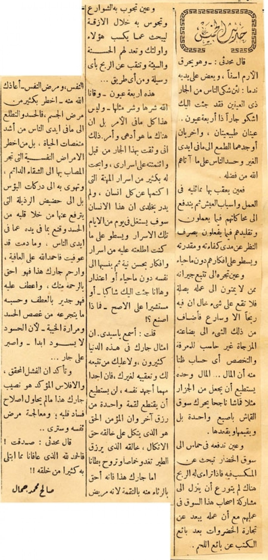 أما جارك هذا فإنه أحق بالرثاء منه بالنقمة لأنه مريض النفس، ومرض النفس – أعاذك الله منه – أخطر بكثير من مرض الجسم، فالحسد والتطلع إلى ما في أيدي الناس من أشد منغصات الحياة، بل من أخطر الأمراض النفسية التي تجر المصاب بها إلى الشقاء الدائم، وتهوى به إلى دركات البؤس بل إلى حضيض الرذيلة التي يترفع عنها من خلا قلبه من الحسد وقنع بما في يده عما في أيدي الناس، وما دمت قد عوفيت فاحمد الله على العافية، وارحم جارك هذا فهو أحق بالرحمة منك، واعطف عليه فهو جدير بالعطف وحسبه ما يتجرعه من غصص الحسد ومرارة الخيبة – لأن الحسود لا يسود أبداً – واصبر على جار...