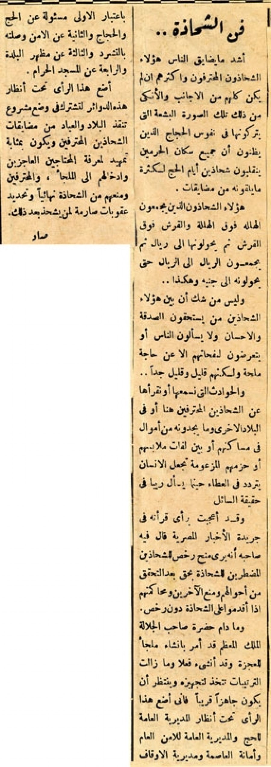 أشد ما يضايق الناس هؤلاء الشحاذون المحترفون وأكثرهم إن لم يكن كلهم من الأجانب والأنكى من ذلك تلك الصورة البشعة التي يتركونها في نفوس الحجاج الذين يظنون أن جميع سكان الحرمين ينقلبون شحاذين أيام الحج لكثرة ما يلقونه من مضايقات.