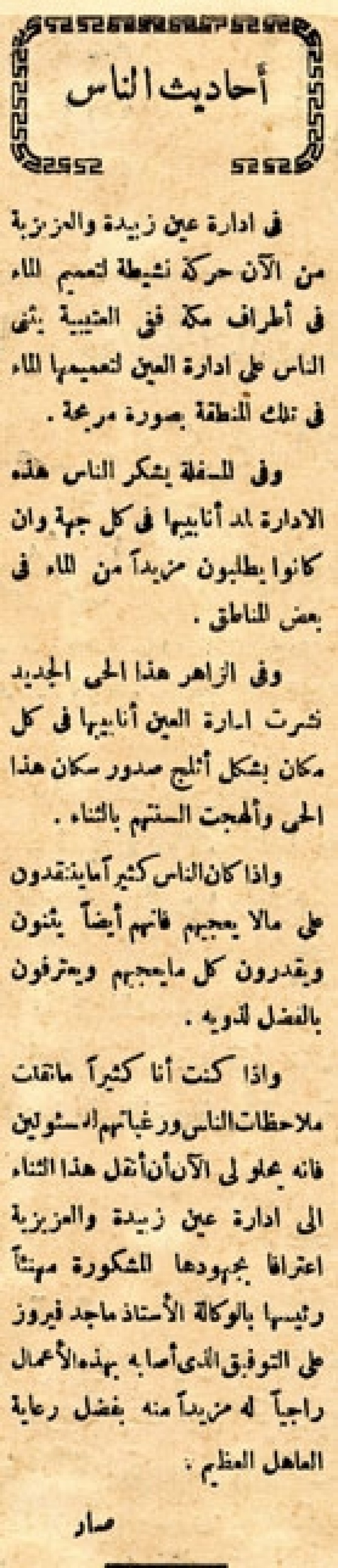 وإذا كنت أنا كثيراً ما نقلت ملاحظات الناس ورغباتهم للمسئولين فإنه يحلو لي الآن أن أنقل هذا الثناء إلى إدارة عين زبيدة والعزيزية اعترافا بجهودها المشكورة مهنئا رئيسها بالوكالة الأستاذ ماجد فيروز على التوفيق الذي أصابه بهذه الأعمال راجيا له مزيدا منه بفضل رعاية العاهل العظيم.