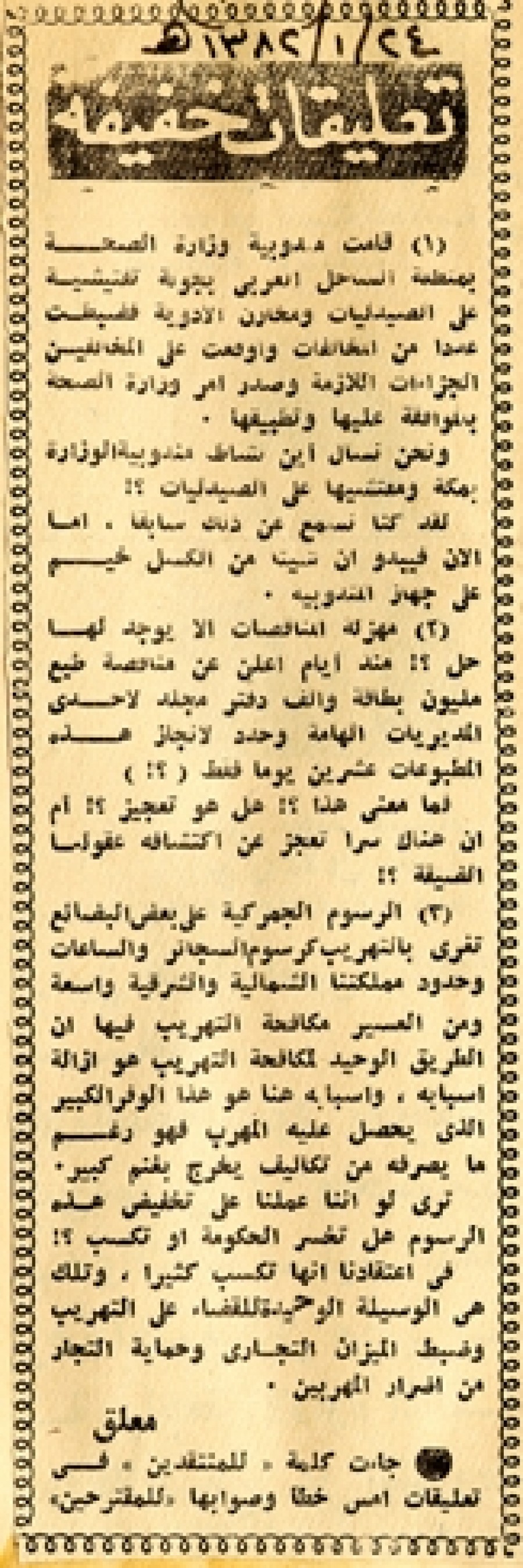 (1) قامت مندوبية وزارة الصحة بمنطقة الساحل العربي بجولة تفتيشية علي الصيدليات ومخازن الأدوية فضبطت عددا من المخالفات وأوقعت علي المخالفين الجزاءات اللازمة وصدر أمر وزارة الصحة بالموافقة عليها وتطبيقها ونحن نسأل أين نشاط مندوبية الوزارة بمكة ومفتشيها علي الصيدليات؟!