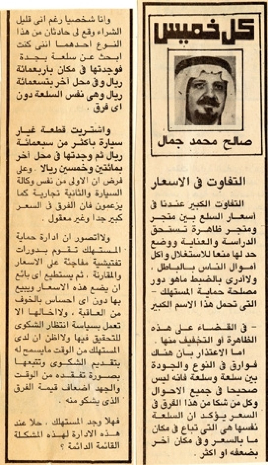 التفاوت الكبير عندنا في أسعار السلع بين متجر ومتجر ظاهرة تستحق الدراسة والعناية ووضع حد لها منعاً للاستغلال وأكل أموال الناس بالباطل، ولا أدرى بالضبط ما هو دور مصلحة حماية المستهلك – التي تحمل هذا الاسم الكبير – في القضاء على هذه الظاهرة أو التخفيف منها.