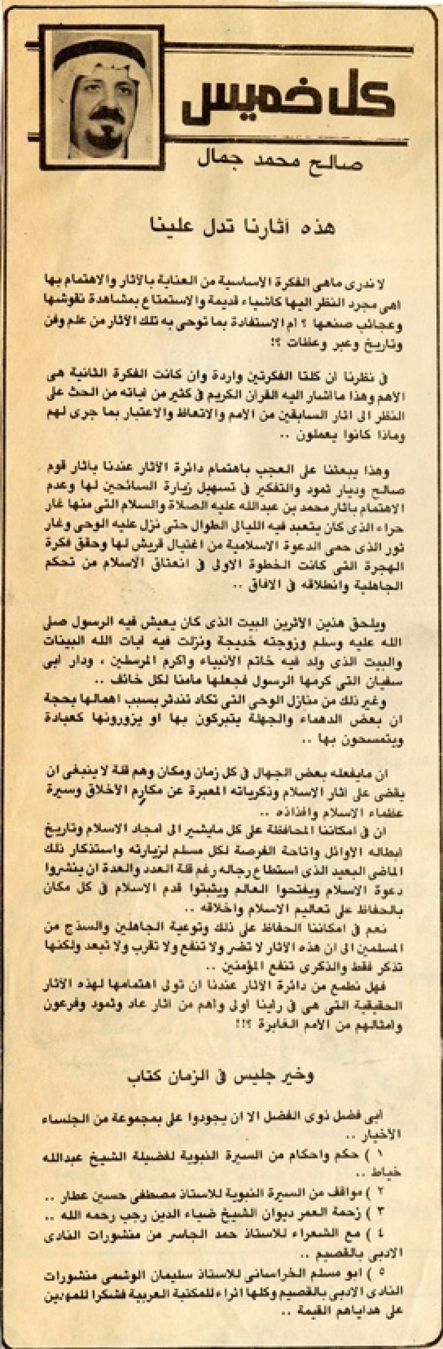 وهذا يبعثنا على العجب باهتمام دائرة الآثار عندنا بآثار قوم صالح وديار ثمود والتفكير في تسهيل زيارة السائحين لها وعدم الاهتمام بآثار محمد بن عبد الله - عليه الصلاة والسلام - التي منها غار حراء الذي كان يتعبد فيه الليالي الطوال حتى نزل عليه الوحي وغار ثور الذي حمى الدعوة الإسلامية من اغتيال قريش لها وحقق فكرة الهجرة التي كانت الخطوة الأولى في اعتناق الإسلام من تحكم الجاهلية وانطلاقه في الآفاق..