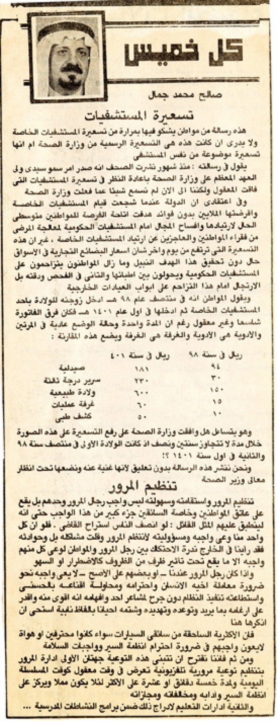يقول في رسالته: منذ شهور نشرت الصحف أنه صدر أمر سمو سيدى ولى العهد المعظم على وزارة الصحة بإعادة النظر في تسعيرة المستشفيات التي فاقت المعقول ولكننا إلى الآن لم نسمع شيئاً عما فعلت وزارة الصحة.