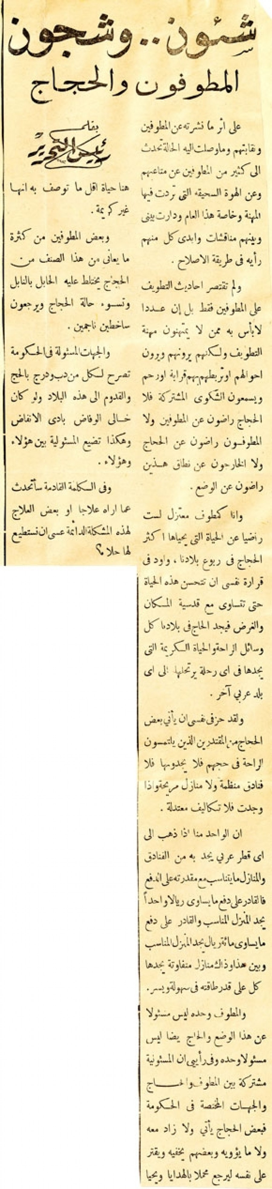 ولقد حز في نفسي أن يأتي بعض الحجاج من المقتدرين الذين يلتمسون الراحة في حجهم فلا يجدونها فلا فنادق منظمة ولا منازل مريحة وإذا وجدت فلا تكاليف معتدلة.