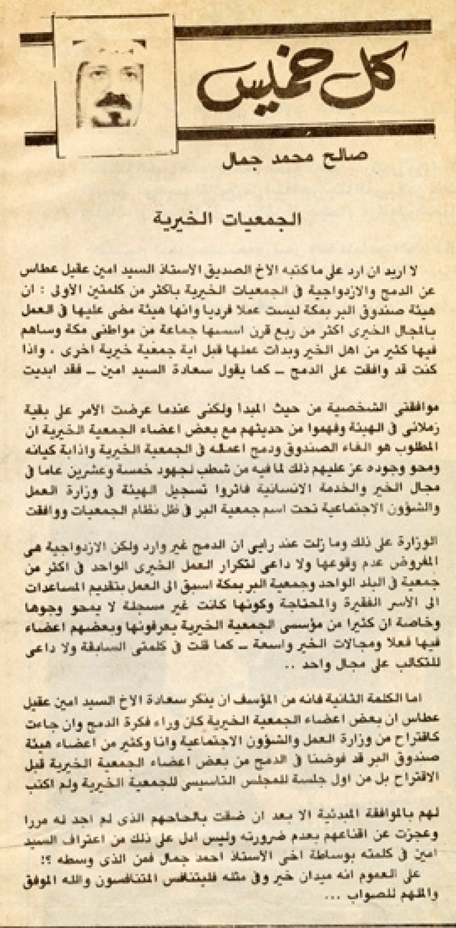 أما الكلمة الثانية فإنه من المؤسف أن ينكر سعادة الأخ السيد أمين عقيل عطاس أن بعض أعضاء الجمعية الخيرية كان وراء فكرة الدمج وأن جاءت كاقتراح من وزارة العمل والشئون الاجتماعية وأنا وكثير من أعضاء هيئة صندوق البر قد فوضنا في الدمج من بعض أعضاء الجمعية الخيرية قبل الاقتراح بل من أول جلسة للمجلس التأسيسي للجمعية الخيرية ولم أكتب لهم بالموافقة المبدئية إلا بعد أن ضقت بإلحاحهم لم أجد له مبرراً وعجزت عن إقناعهم بعدم ضرورته وليس أدل على ذلك من اعتراف السيد أمين في كلمته بوساطة أخي الأستاذ أحمد جمال فمن الذي وسطه؟!