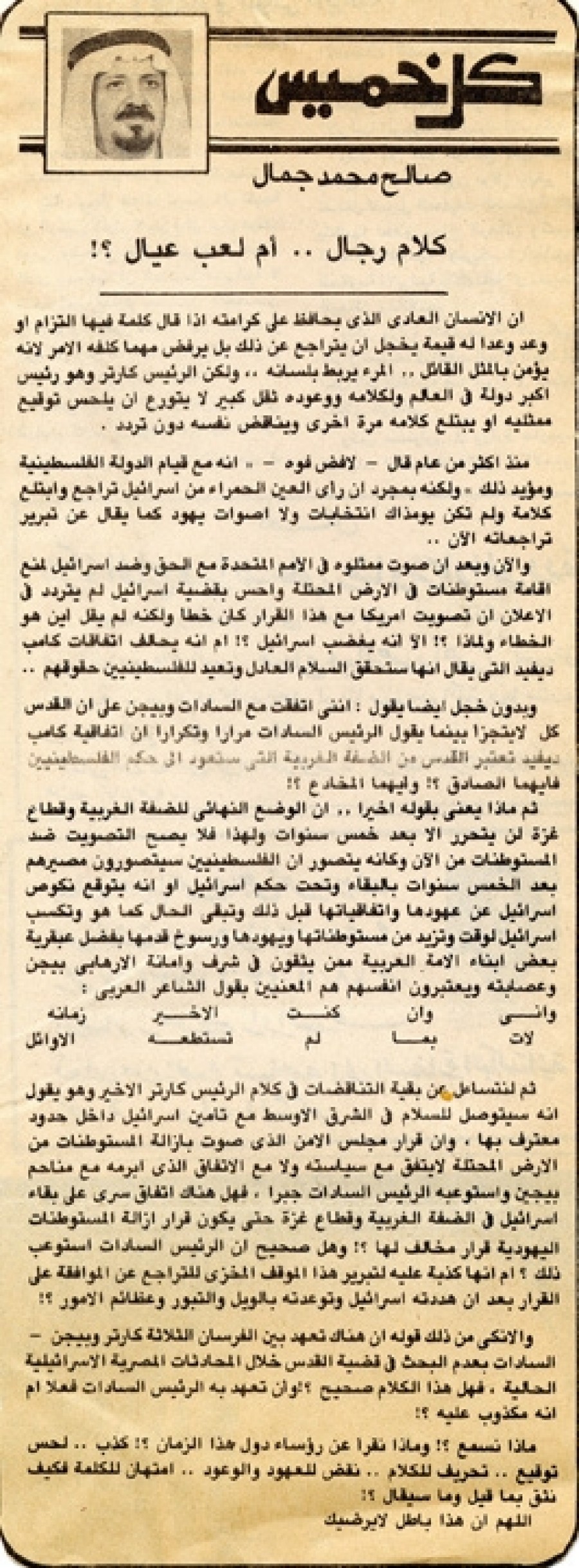 ثم ماذا يعنى بقوله أخيراً.. أن الوضع النهائي للضفة الغربية وقطاع غزة لن يتحرر إلا بعد خمس سنوات ولهذا فلا يصح التصويت ضد المستوطنات من الآن وكأنه يتصور أن الفلسطينيين سيتصورون مصيرهم بعد الخمس سنوات بالبقاء وتحت حكم إسرائيل أو إنه يتوقع نكوص إسرائيل عن عهودها واتفاقياتها قبل ذلك وتبقى الحال كما هو وتكسب إسرائيل الوقت وتزيد من مستوطناتها ويهودها ورسوخ قدمها بفضل عبقرية بعض أبناء الأمة العربية ممن يثقون في شرف وأمانة الإرهابي بيجن وعصابته ويعتبرون أنفسهم هم المعنيين بقول الشاعر العربي: