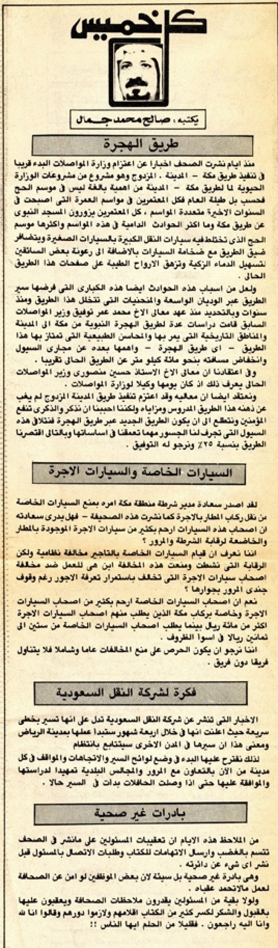 ونعتقد أيضاً أن معاليه وقد اعتزم تنفيذ طريق المدينة المزدوج لم يغب عن ذهنه هذا الطريق المدروس ومزاياه ولكننا أحببنا أن نذكر والذكرى تنفع المؤمنين ونتطلع إلى أن يكون الطريق الجديد عبر طريق الهجرة فنتلافى هذه السيول التي تجرف لنا الجسور مهما تعمقنا في أساستها وبالتالي اقتصرنا الطريق بنسبة 25٪ ونرجو له التوفيق.