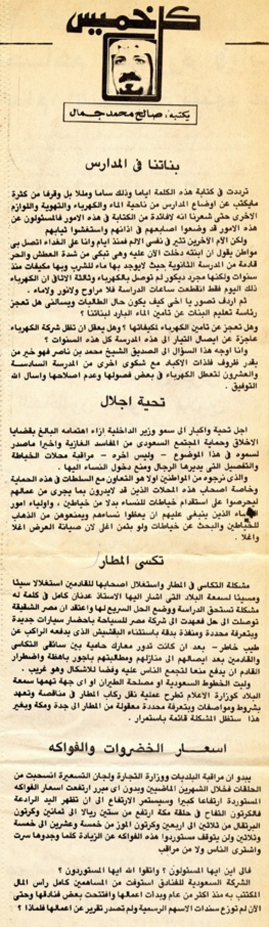مشكلة التكاسي في المطار واستغلال أصحابها للقادمين استغلالاً سيئاً ومسيئاً لسمعة البلاد التي أشار إليها الأستاذ عدنان كامل في كلمة له مشكلة تستحق الدراسة ووضع الحل السريع لها وأعتقد أن مصر الشقيقة توصلت إلى حل فعهدت إلى شركة مصر للسياحة بإحضار سيارات جديدة وبتعرفة محددة ومنفذة بدقة باستثناء البقشيش الذي يدفعه الراكب عن طيب خاطر – بعد أن كانت تدور معارك حامية بين سائقي التكاسي والقادمين بعد إيصالهم إلى منازلهم ومطالبتهم بأجور باهظة واضطرار القادم أن يدفع منعاً لتجمع الناس عليه وفضاً للإشكال وهو غريب.