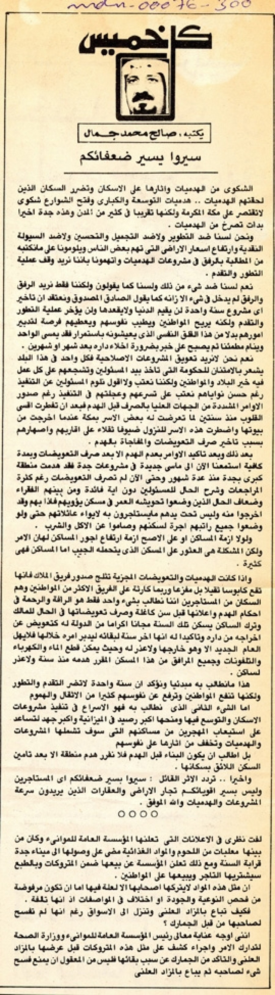 وإذا كانت الهدميات والتعويضات المجزية تثلج صدور فريق الملاك فإنها تقع كابوساً ثقيلاً بل مفزعاً وربما كارثة على الفريق الأكثر من المواطنين وهم السكان من المستأجرين إننا نطالب بشيء واحد فقط هو الرأفة والرحمة في أحكام الهدم وإعلانها قبل سنة كاملة وصرف تعويضاتها في الحال للمالك وترك الساكن يسكن تلك السنة مجاناً إكراماً من الدولة له كتعويض عن إخراجه من داره وتأكيداً له أنها آخر سنة لبقائه ليدبر أمره خلالها فلا يهل العام الجديد إلا وهو خارجها ولا عذر له وحيث يمكن قطع الماء والكهرباء والتلفونات وجميع المرافق من هذا المسكن المقرر هدمه منذ سنة ولا عذر لساكن.