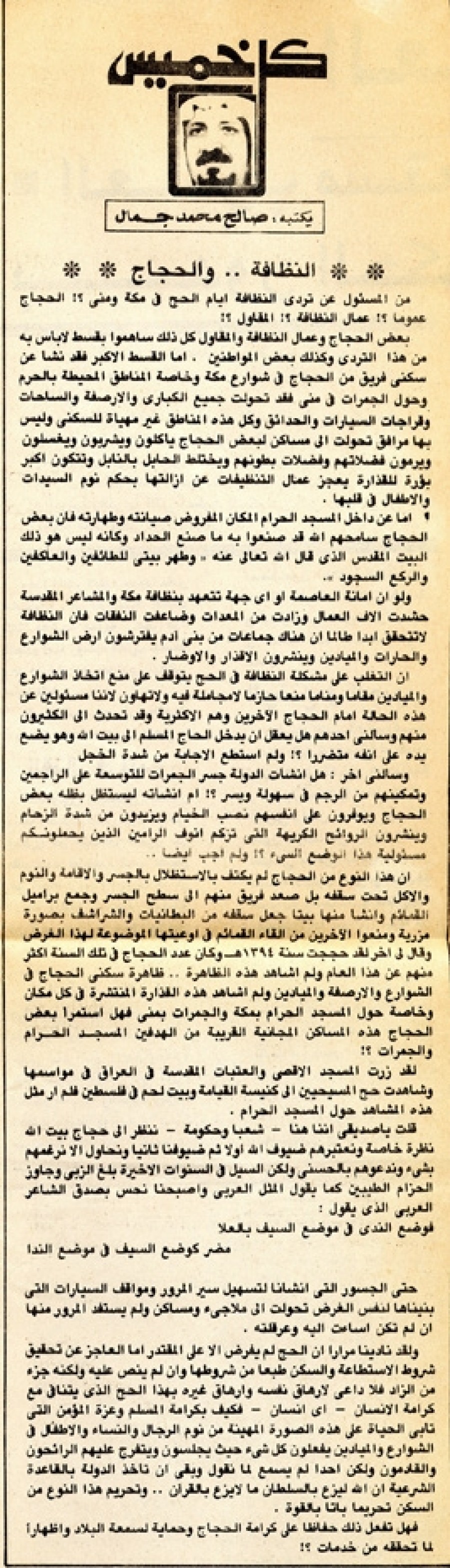 إن التغلب على مشكلة النظافة في الحج يتوقف على منع اتخاذ الشوارع والميادين مقاماً ومناماً منعاً جازماً لا مجاملة فيه ولا تهاون لأننا مسئولين عن هذه الحالة أمام الحجاج الآخرين وهم الأكثرية وقد تحدث إلى الكثيرون منهم وسألني أحدهم هل يعقل أن يدخل الحاج المسلم إلى بيت الله وهو يضع يده على أنفه متضرراً؟! ولم أستطع الإجابة من شدة الخجل.