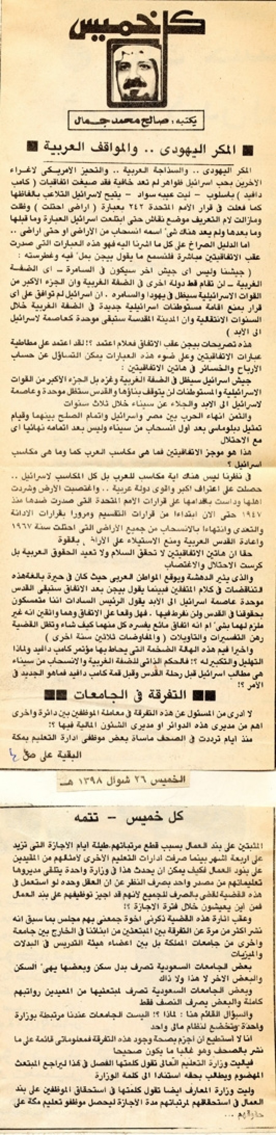 وأخيرا فيم هذه الهالة الضخمة التي يحاط بها مؤتمر كامب دافيد ولماذا التهليل والتكبير له؟! فالحكم الذاتي للضفة الغربية والانسحاب من سيناء هي مطالب إسرائيل قبل رحلة القدس وقبل قمة كامب دافيد فما هو الجديد في الأمر؟!