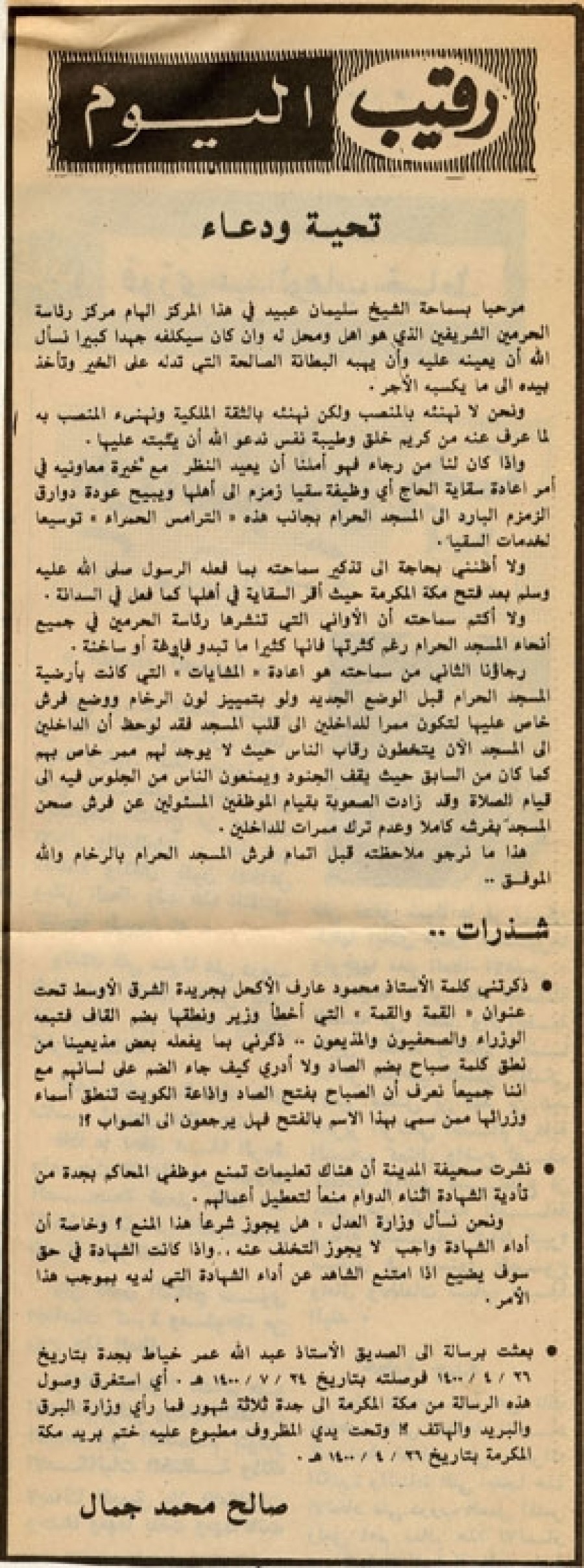 · بعثت برسالة إلي الصديق الأستاذ عبد الله عمر خياط بجدة بتاريخ 26/4/1400 فوصلته بتاريخ 24/7/1400ﻫ ، أي استغرق وصول هذه الرسالة من مكة المكرمة إلي جدة ثلاثة شهور فما رأي وزارة البرق والبريد والهاتف؟! وتحت يدي المظروف مطبوع عليه ختم بريد مكة المكرمة بتاريخ 26/4/1400ﻫ.