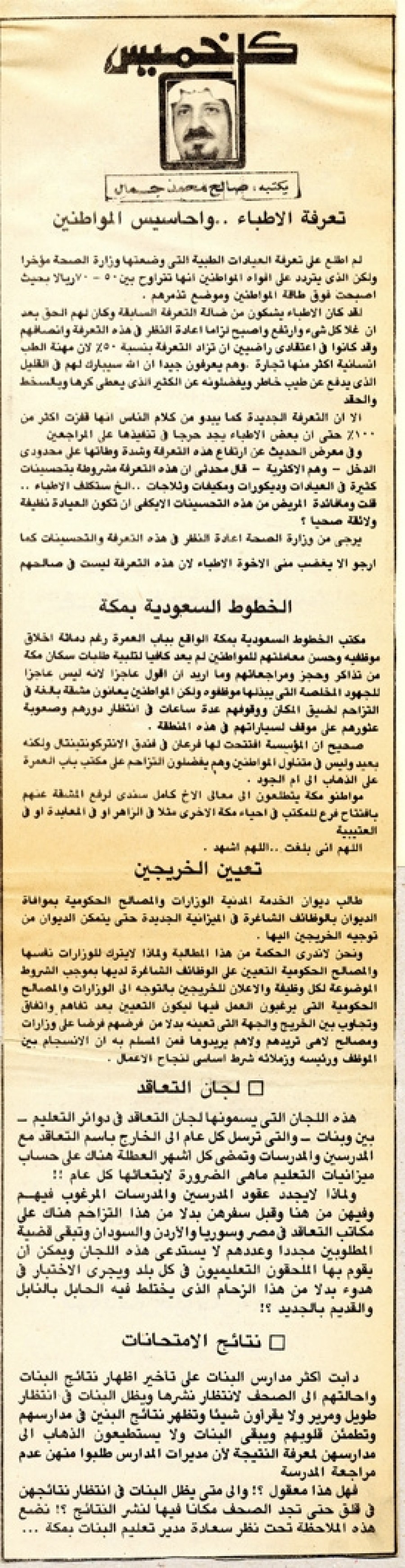 لقد كان الأطباء يشكون من ضآلة التعرفة السابقة وكان لهم الحق بعد أن غلا كل شئ وارتفع وأصبح لزاماً إعادة النظر في هذه التعرفة وانصافهم وقد كانوا في اعتقادي راضين أن تزاد التعرفة بنسبة 50% لأن مهنة الطب إنسانية أكثر منها تجارة وهم يعرفون جيداً أن الله سيبارك لهم في القليل الذي يدفع عن طيب خاطر ويفضلونه عن الكثير الذي يعطي كرهاً وبالسخط والحقد.