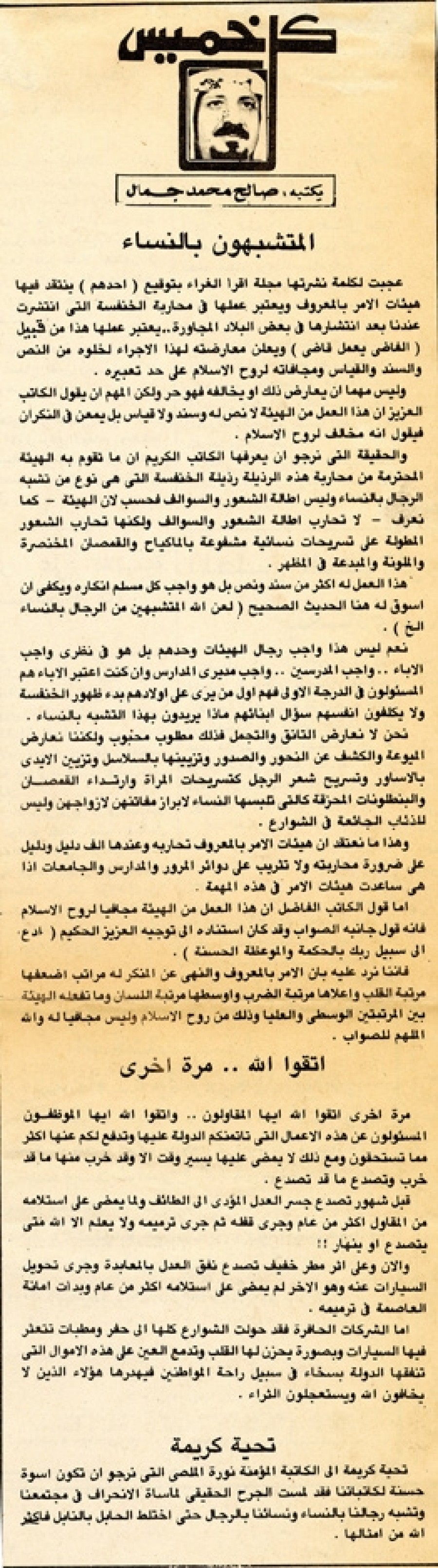 عجبت لكلمة نشرتها مجلة اقرأ بتوقيع (أحدهم) ينتقد فيها هيئات الأمر بالمعروف ويعتبر عملها في محاربة الخنفسة التي انتشرت عندنا بعد انتشارها في بعض البلاد المجاورة.. يعتبر عملها هذا من قبيل (الفاضي يعمل قاضي) ويعلن معارضته لهذا الإجراء لخلوه من النص والسند والقياس ومجافاته لروح الإسلام على حد تعبيره.