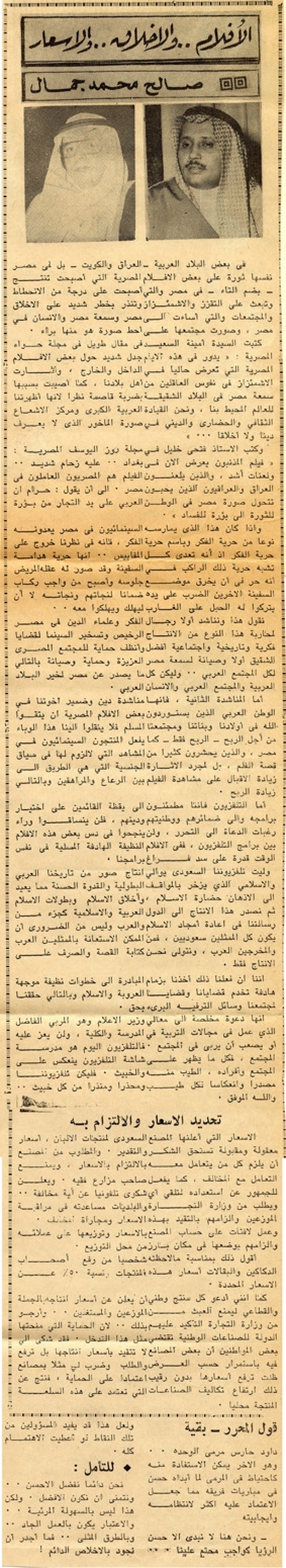 أما التلفزيون فإننا مطمئنون إلى يقظة القائمين على اختيار برامجه وإلى ضمائرهم ووطنيتهم، فلن ينساقوا وراء رغبات الدعاة إلى التحرر، ولن ينجحوا في دس بعض هذه الأفلام بين برامج التلفزيون، ففي الأفلام النظيفة الهادفة المسلية في نفس الوقت قدرة على سد فراغ برامجنا.