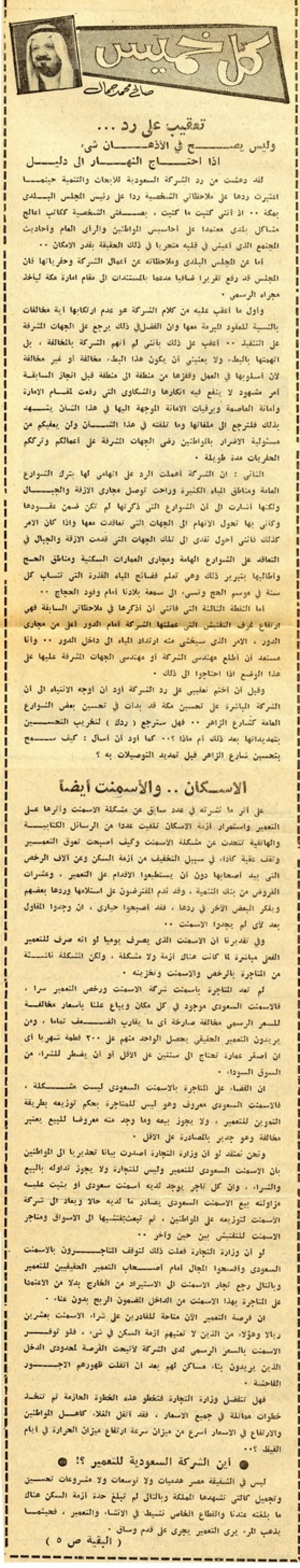 إن فرصة التعمير الآن متاحة للقادرين على شراء الأسمنت بعشرين ريالاً وهؤلاء من الذين لا تعنيهم أزمة السكن في شئ، فلو توفر الأسمنت بالسعر الرسمي لدى الشركة لأتيحت الفرصة لمحدودي الدخل الذين يريدون بناء مساكن لهم بعد أن أثقلت ظهورهم الأجور الفاحشة.