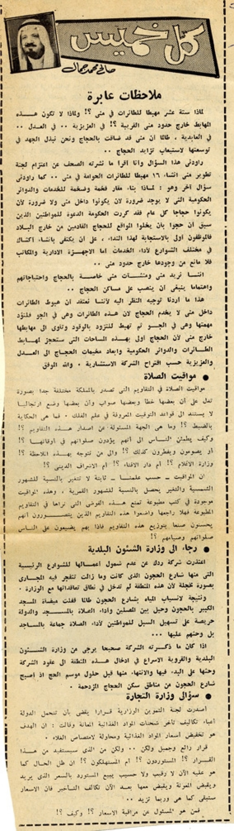 هذا ما أردنا توجيه النظر إليه لأننا نعتقد أن هبوط الطائرات داخل منى لا يخدم الحجاج لأن هذه الطائرات وهي في الجو فتلؤد مهمتها وهي في الجو ثم تهبط للتزود بالوقود وتأوى إلى مهابطها خارج منى لأن الحجاج أولى بهذه المساحات التي ستحجز لمهابط الطائرات والدوائر الحكومية وإبعاد مخيمات الحجاج إلى العدل والعزيزية حسب اقتراح الشركة الاستشارية. والله الموفق.