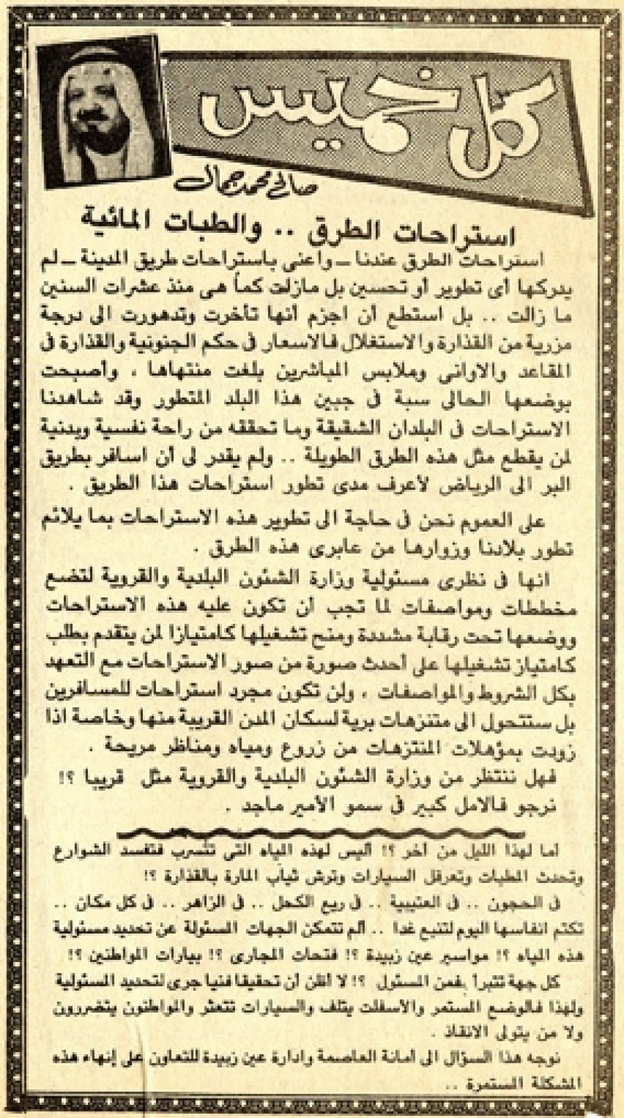 استراحات الطرق عندنا – وأعني باستراحات طريق المدينة – لم يدركها أي تطوير أو تحسين بل ما زالت كما هي منذ عشرات السنين.. بل أستطع أن أجزم أنها تأخرت وتدهورت إلى درجة مزرية من القذارة والاستغلال فالأسعار في حكم الجنونية والقذارة في المقاعد والأواني وملابس المباشرين بلغت منتهاها، وأصبحت الاستراحات في البلدان الشقيقة وما تحققه من راحة نفسية وبدنية لمن يقطع مثل هذه الطرق الطويلة.. ولم يقدر لي أن أسافر بطريق البر إلى الرياض لأعرف مدى تطور استراحات هذا الطريق.