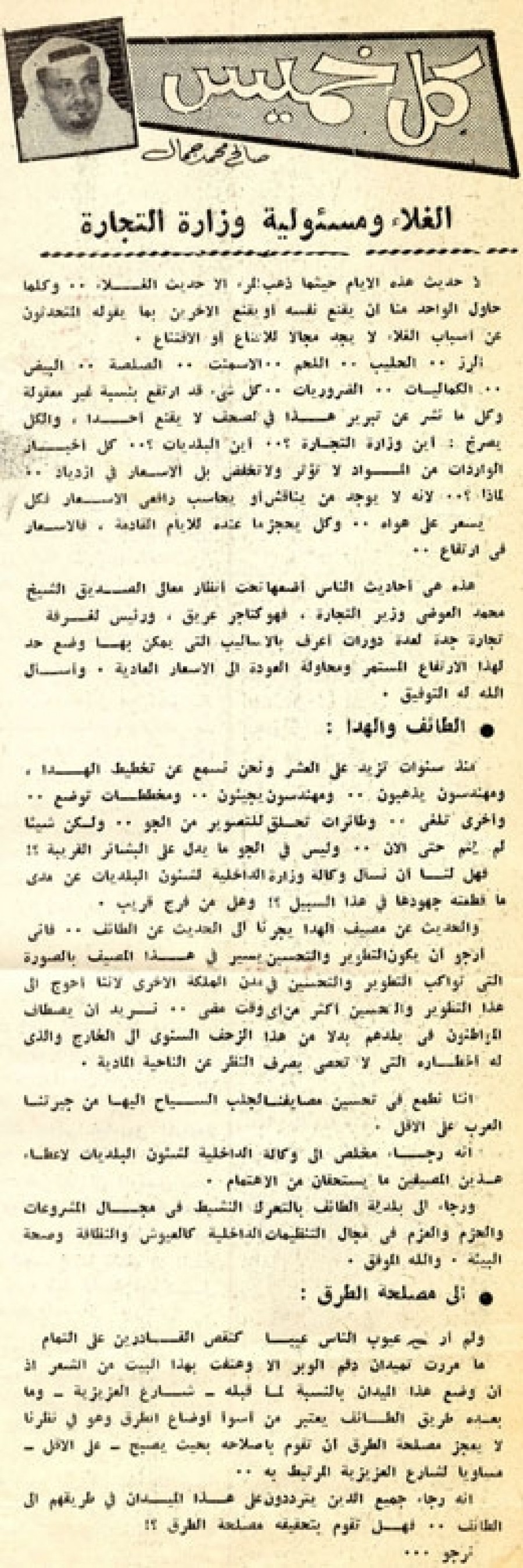 هذه هي أحاديث الناس أضعها تحت أنظار معالي الصديق الشيخ محمد العوضي وزير التجارة، فهو كتاجر عريق، ورئيس لغرفة تجارة جدة لعدة دورات أعرف بالأساليب التي يمكن بها وضع حد لهذا الارتفاع المستمر ومحاولة العودة إلى الأسعار العادية. وأسأل الله له التوفيق.