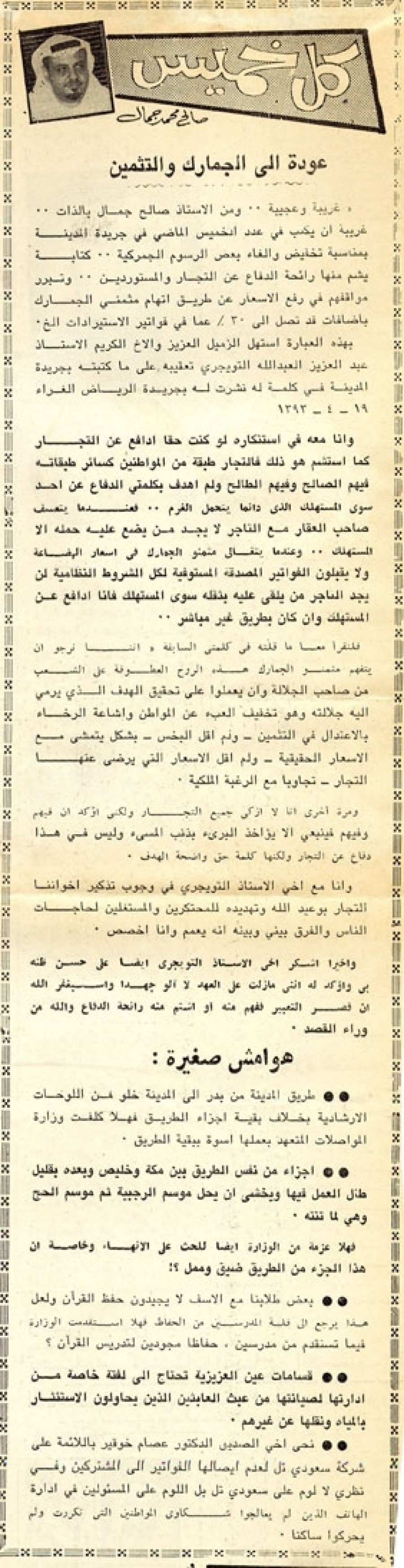"غريبة وعجيبة.. ومن الأستاذ صالح جمال بالذات.. غريبة أن يكتب في عدد الخميس الماضي في جريدة المدينة بمناسبة تخفيض والغاء بعض الرسوم الجمركية.. كتابة يشم منها رائحة الدفاع عن التجار والمستوردين.. وتبرر مواقفهم في رفع الأسعار عن طريق اتهام مثمني الجمارك بإضافات قد تصل إلى 30% عما في فواتير الاستيرادات إلخ".