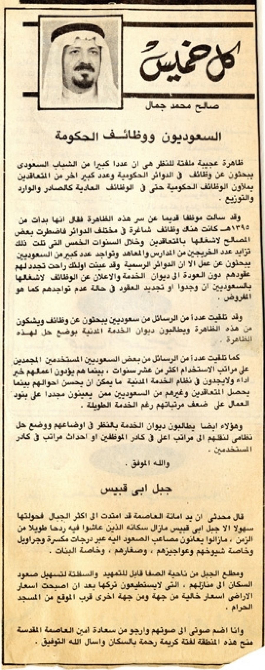 ظاهرة عجيبة ملفتة للنظر هي أن عدداً كبيراً من الشباب السعودي يبحثون عن وظائف في الدوائر الحكومية وعدد كبير آخر من المتعاقدين يملأون الوظائف الحكومية حتى في الوظائف العادية كالصادر والوارد والتوزيع.