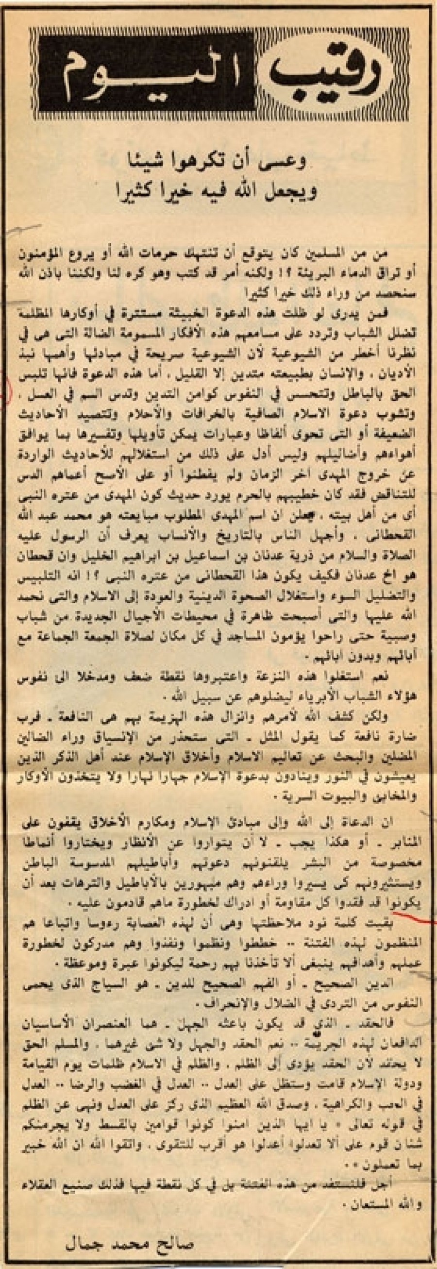 فمن يدري لو ظلت هذه الدعوة الخبيثة مستترة في أوكارها المظلمة تضلل الشباب وتردد على مسامعهم هذه الأفكار المسمومة الضالة التي هي في نظرنا أخطر من الشيوعية لأن الشيوعية صريحة في مبادئها وأهمها نبذ الأديان، والإنسان بطبيعته متدين إلا القليل، أما هذه الدعوة فإنها تلبس الحق بالباطل وتتحسس في النفوس كوامن التدين وتدس السم في العسل. وتشوب دعوة الإسلام الصافية بالخرافات والأحلام وتتصيد الأحاديث الضعيفة أو التي تحوي ألفاظا وعبارات يمكن تأويلها وتفسيرها بما يوافق أهواءهم وأضاليلهم وليس أدل على ذلك من استغلالهم للأحاديث الواردة عن خروج المهدي آخر الزمان ولم يفطنوا أو على الأصح أعماهم الدس للتناقض فقد كان خطيبهم بالحرم يورد حديث كون المهدي من عترة النبي أي من أهل بيته، يعلن أن اسم المهدي المطلوب مبايعته هو محمد عبد الله القحطاني، وأجهل الناس بالتاريخ والأنساب يعرف أن الرسول -عليه الصلاة والسلام- من ذرية عدنان بن إسماعيل بن إبراهيم الخليل وأن قحطان هو أخ عدنان فكيف يكون هذا القحطاني من عترة النبي؟! إنه التلبيس والتضليل السوء واستغلال الصحوة الدينية والعودة إلى الإسلام والتي نحمد الله عليها والتي أصبحت ظاهرة في محيطات الأجيال الجديدة من شباب وصبية حتى راحوا يؤمون المساجد في كل مكان لصلاة الجمعة الجماعة مع آبائهم وبدون آبائهم.
