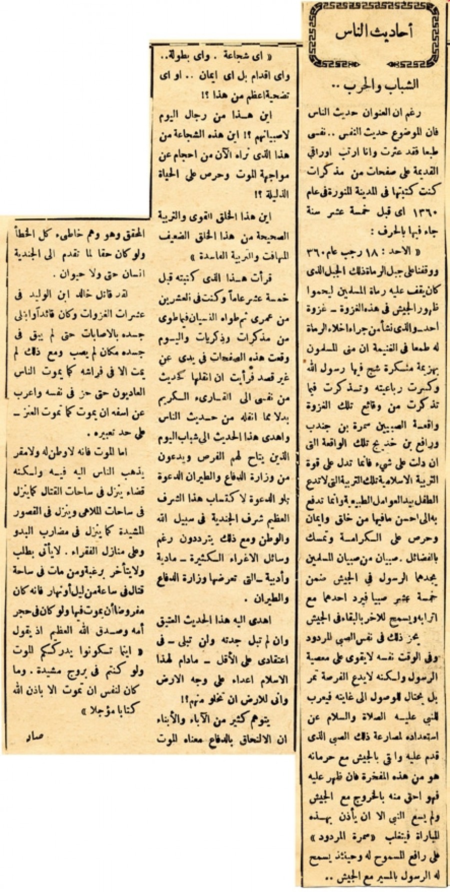 قرأت هذا الذي كتبته قبل خمسة عشر عاماً وكنت في العشرين من عمري ثم طواه النسيان فيما طوي من مذكرات وذكريات واليوم وقعت هذه الصفحات في يدي عن غير قصد فرأيت أن أنقلها كحديث من نفسي إلي القارئ الكريم بدلا مما أنقله من حديث الناس وأهدي هذا الحديث إلي شباب اليوم الذي يتاح لهم الفرص ويدعون من وزارة الدفاع والطيران الدعوة تلو الدعوة لاكتساب هذا الشرف العظيم شرف الجندية في سبيل الله والوطن ومع ذلك يترددون رغم وسائل الإغراء الكثيرة - مادية وأدبية - والتي تعرضها وزارة الدفاع والطيران.