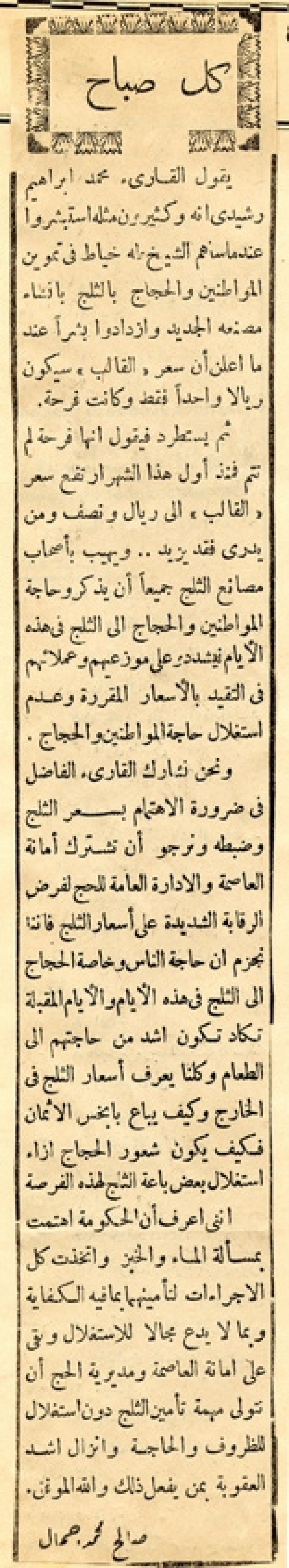 ثم يستطرد فيقول إنها فرحة لم تتم فمنذ أول هذا الشهر ارتفع سعر "القالب" إلي ريال ونصف ومن يدري فقد يزيد.. و يهيب بأصحاب مصانع الثلج جميعاً أن يذكروا حاجة الموطنين والحجاج إلي الثلج في هذه الأيام فيشددوا على موزعيهم وعملائهم في التقيد بالأسعار المقررة وعدم استغلال حاجة المواطنين والحجاج.