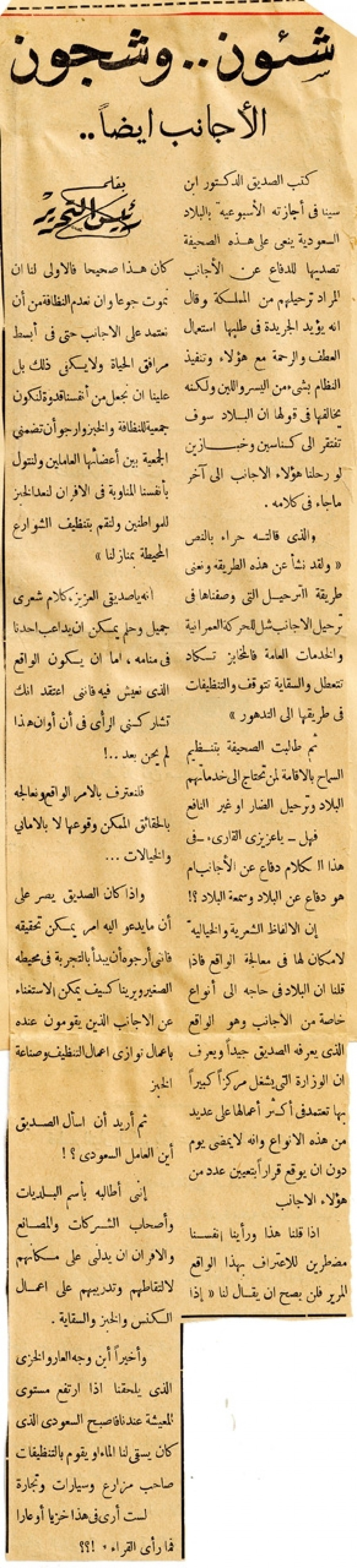 كتب الصديق الدكتور ابن سينا في أجازته الأسبوعية بالبلاد السعودية ينعي على هذه الصحيفة تصديها للدفاع عن الأجانب المراد ترحيلهم من المملكة وقال أنه يؤيد الجريدة في طلبها استعمال العطف والرحمة مع هؤلاء وتنفيذ النظام بشيء من اليسر واللين ولكنه يخالفها في قولها أن البلاد سوف تفتقر إلي كناسين وخبازين لو رحلنا هؤلاء الأجانب إلي آخر ما جاء في كلامه.