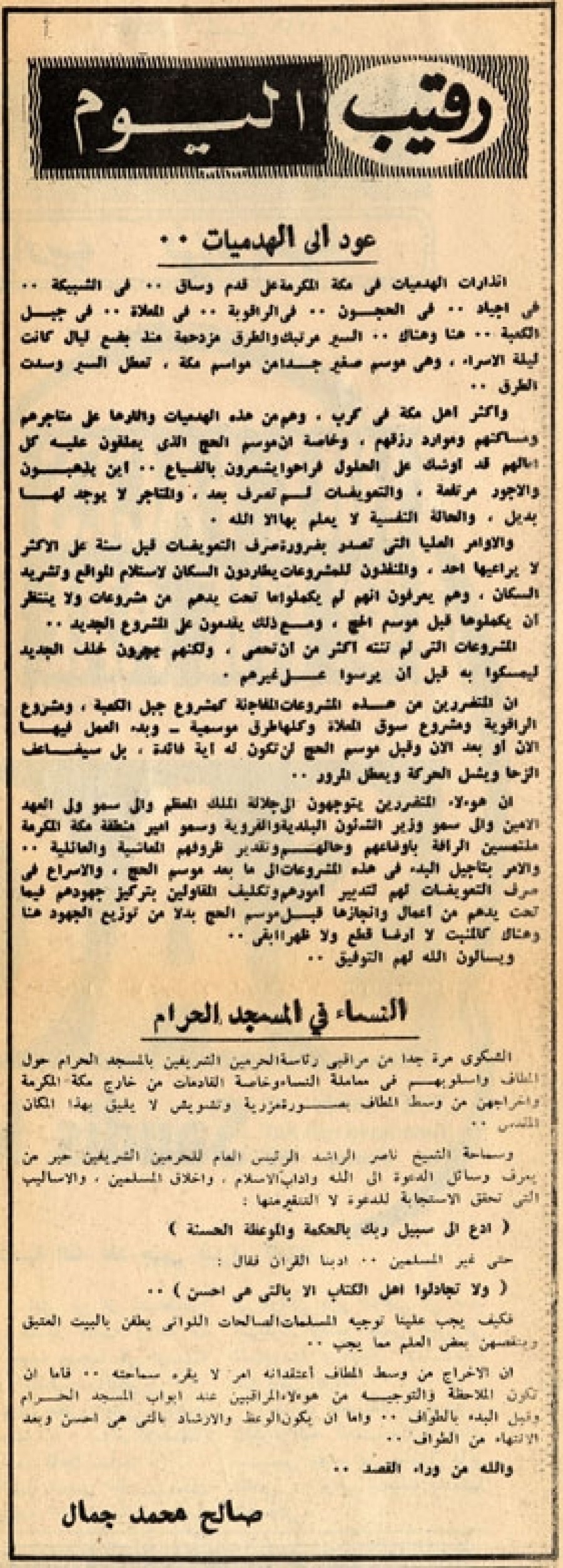 وأكثر أهل مكة في كرب. وهم من هذه الهدميات وآثارها على متاجرهم ومساكنهم وموارد رزقهم، وخاصة أن موسم الحج الذي يعلقون عليه كل آمالهم قد أوشك على الحلول فراحوا يشعرون بالضياع.. أين يذهبون والأجور مرتفعة. والتعويضات لم تصرف بعد، والمتاجر لا يوجد لها بديل، والحالة النفسية لا يعلم بها إلا الله.