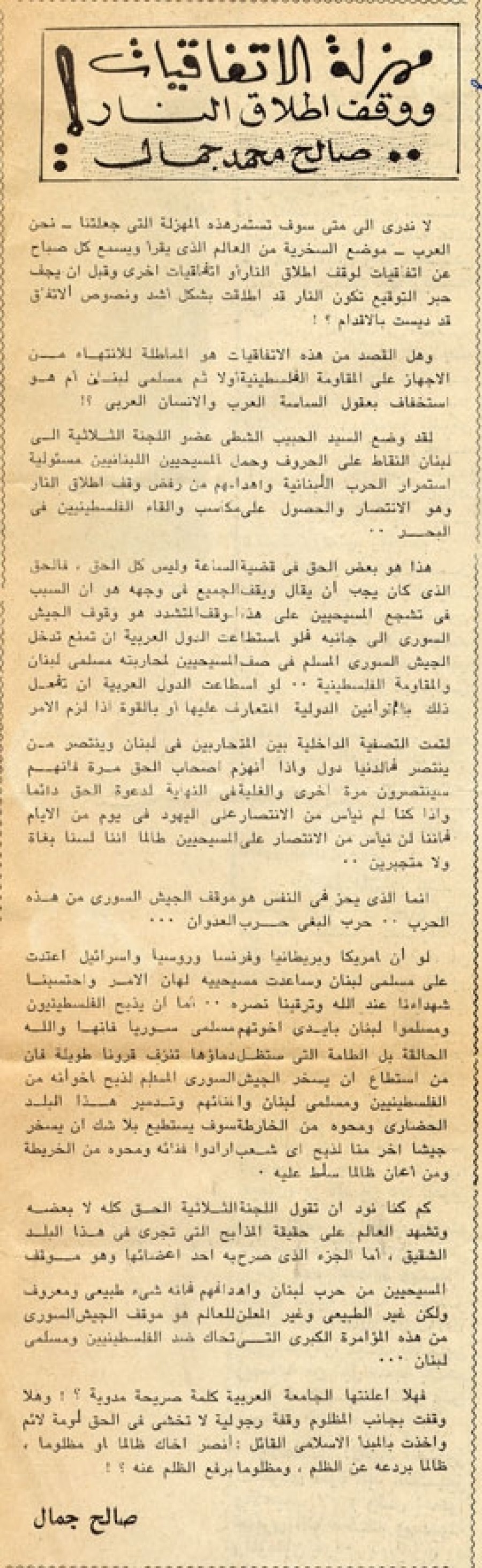 كم كنا نود أن تقول اللجنة الثلاثية الحق كله لا بعضه وتشهد العالم على حقيقة المذابح التي تجرى في هذا البلد الشقيق، أما الجزء الذي صرح به أحد أعضائها وهو موقف المسيحيين من حرب لبنان وأهدافهم فإنه شيء طبيعي ومعروف ولكن غير الطبيعي وغير المعلن للعالم هو موقف الجيش السوري من هذه المؤامرة الكبرى التي تحاك ضد الفلسطينيين ومسلمي لبنان...