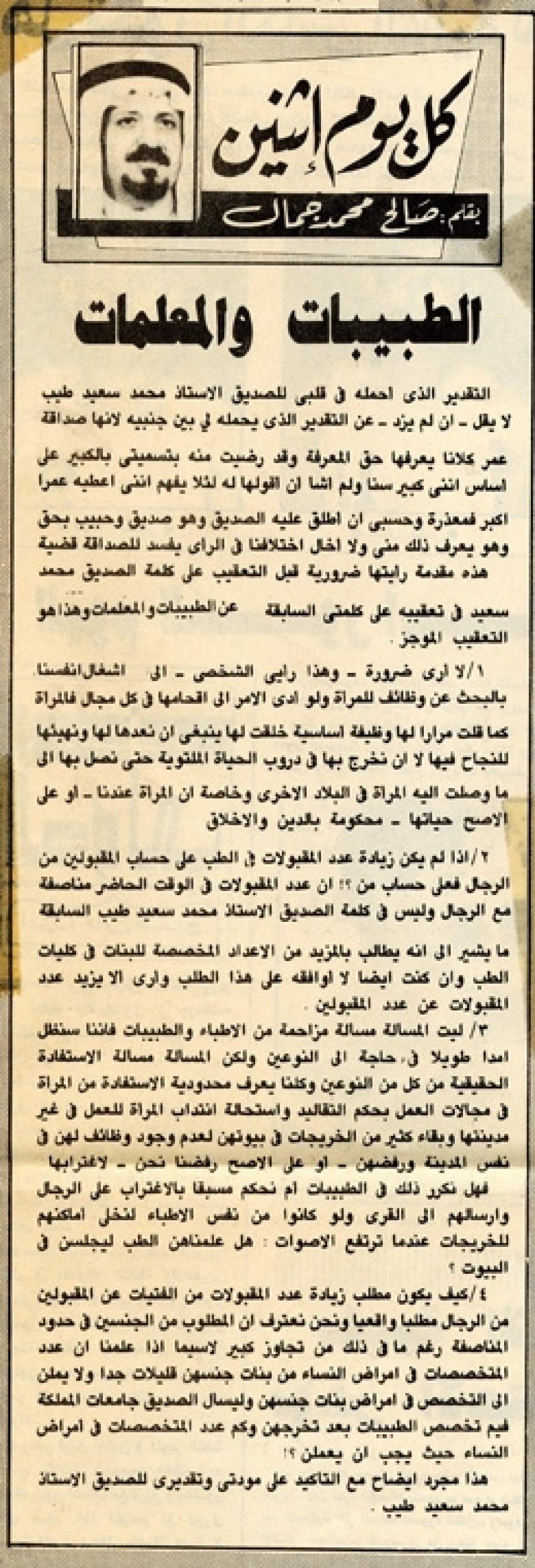 عمر كلانا يعرفها حق المعرفة وقد رضيت منه بتسميتي بالكبير على أساس أنني كبير سناً ولم أشأ أن أقولها له لئلا يفهم أنني أعطية عمراً أكبر فمعذرة وحسبي أن أطلق عليه الصديق وهو صديق وحبيب بحق وهو يعرف ذلك مني ولا أخال اختلافنا في الرأي يفسد للصداقة قضية هذه مقدمة رأيتها ضرورية قبل التعقيب على كلمة الصديق محمد سعيد في تعقيبه على كلمتي السابقة عن الطبيبات والمعلمات وهذا هو التعقيب الموجز.