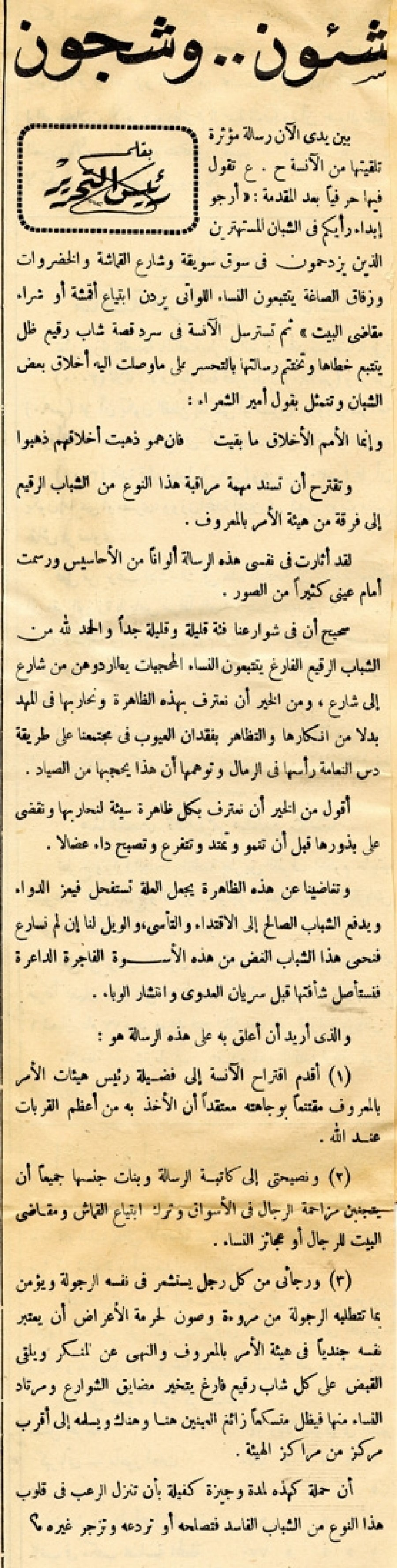 3) ورجائي من كل رجل يستشعر في نفسه الرجولة ويؤمن بما تتطلبه الرجولة من مروءة وصون لحرمة الأعراض أن يعتبر نفسه جندياً في هيئة الأمر بالمعروف والنهي عن المنكر ويلقي القبض على كل شاب رقيع فارغ يتخير مضايق الشوارع ومرتاد النساء منها فيظل مستكعاً زائغ العينين هنا وهناك ويسلمه إلي أقرب مركز من مراكز الهيئة.