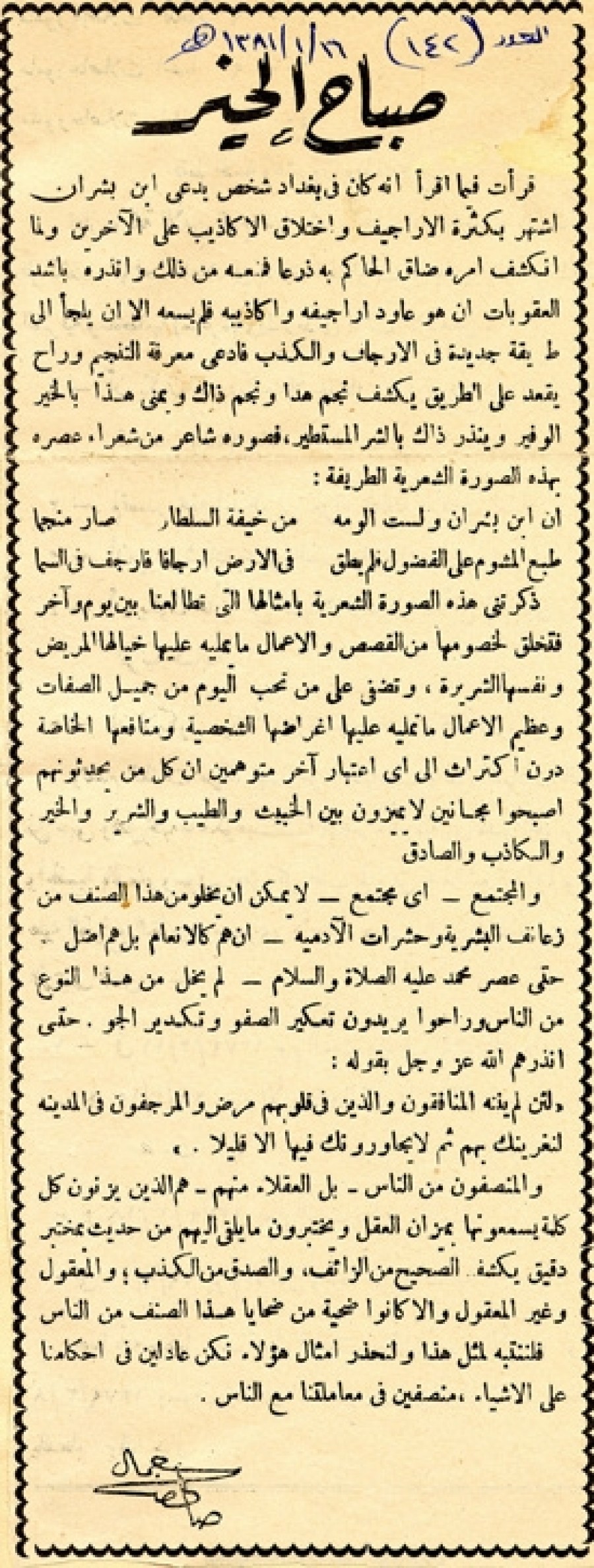 قرأت فيما أقرأ أنه كان في بغداد شخص يدعي ابن بشران اشتهر بكثرة الأراجيف واختلاق الأكاذيب على الآخرين ولما أنكشف أمره ضاق الحاكم به ذرعاً فمنعه من ذلك وأنذره بأشد العقوبات إن هو عاود أراجيفه وأكاذيبه فلم يسعه إلا أن يلجأ إلي طريقة جديدة في الإرجاف والكذب فادعى معرفة التنجيم وراح يقعد على الطريق يكشف نجم هذا ونجم هذا ونجم ذاك ويمني هذا بالخير الوفير وينذر ذلك بالشر المستطير، فصوره شاعر من شعراء عصره بهذه الصورة الشعرية الطريفة: