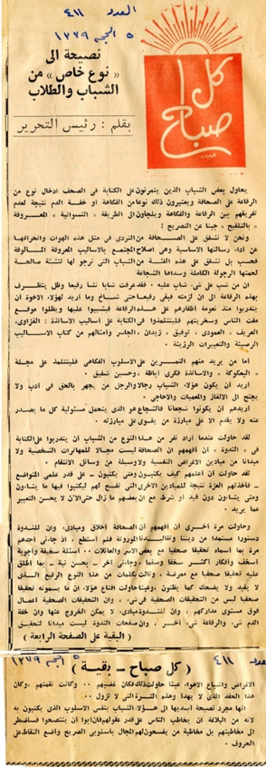 ونحن لا نشفق على الصحافة من التردي في مثل هذه الهوات وانحرافها عن أداء رسالتها الأساسية وهي إصلاح المجتمع بالأساليب المعروفة المألوفة فحسب بل نشفق على هذه الفئة من الشباب التي نرجو لها تنشئة صالحة لحمتها الرجولة الكاملة وسداها الشجاعة.