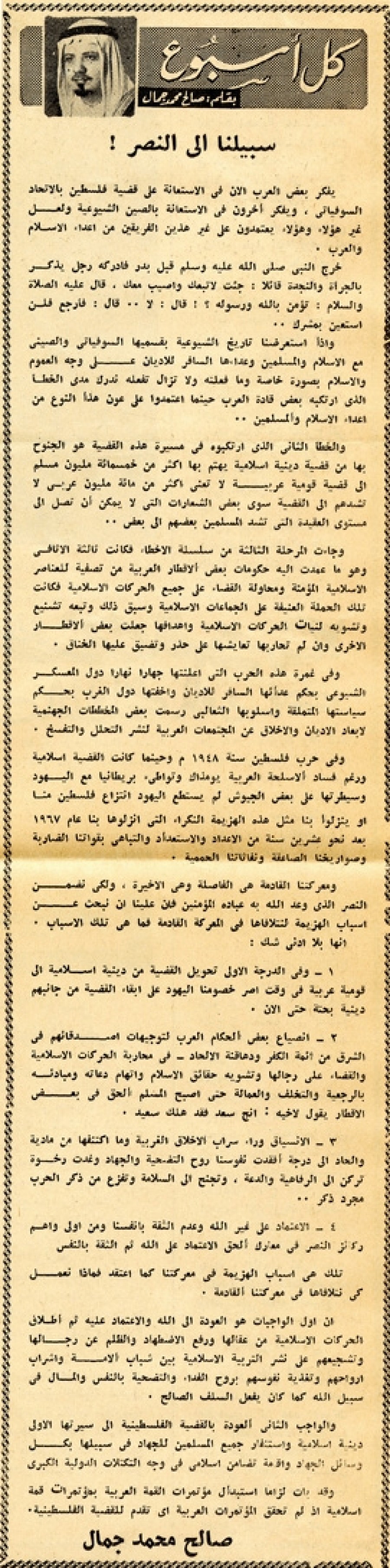 يفكر بعض العرب الآن في الاستعانة على قضية فلسطين بالاتحاد السوفيتي، ويفكر آخرون في الاستعانة بالصين الشيوعية ولعل غير هؤلاء يعتمدون على غير هذين الفريقين من أعداء الإسلام والعرب.