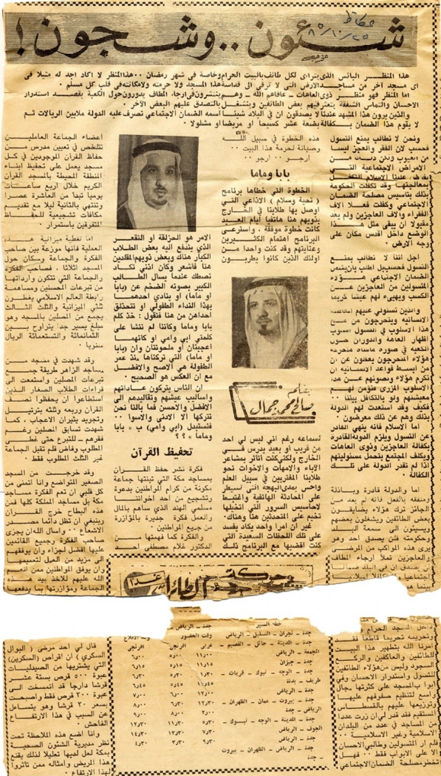 ونحن لا نطالب منع التسول فحسب لأن الفقر والعجز ليسا من العيوب ولكن ذلك من الأمراض الاجتماعية التي بفرض علينا الإسلام التكفل بمعالجتها وقد تكفلت الحكومة بذلك بتأسيس مصلحة الضمان الاجتماعي وكفلت فعلاً آلاف الفقراء وآلاف العاجزين ولم يعد مقبولاً أن يبقي مثل هذا الوضع داخل أقدس مكان على وجه الأرض.