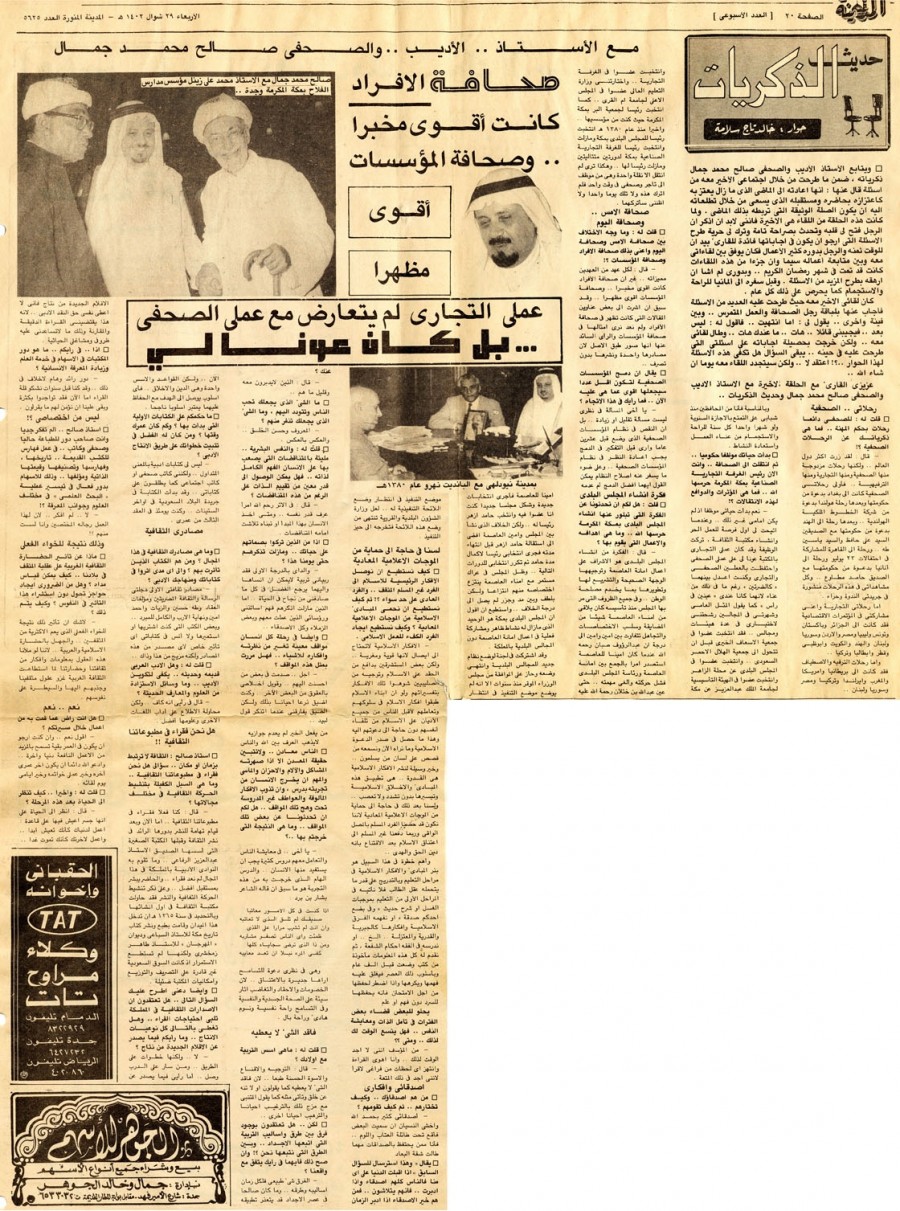 ويتابع الأستاذ الأديب والصحفي صالح محمد جمال ذكرياته، ضمن ما طرحت من خلال اجتماعي الأخير معه من أسئلة قال عنها: أنها أعادته إلى الماضي الذي مازال يعتز به كاعتزازه بحاضره ومستقبله الذي يسعى من خلال تطلعاته إليه أن يكون الصلة الوثيقة التي تربطه بذلك الماضي. ولما كانت هذه الحلقة من اللقاء هي الأخيرة فإنني لابد أن أذكر أن الرجل فتح لي قلبه وتحدث بصراحة تامة وترك لي حرية طرح الأسئلة التي أرجو أن يكون في إجاباتها فائدة للقارئ بيد أن للوقت ثمنه والرجل بدوره كثير الأعمال فكان يوفق بين لقاءاتي معه وبين متابعة أعماله سيما وأن جزءاً من هذه اللقاءات كانت قد تمت في شهر رمضان الكريم.. وبدوري لم أشأ أن أرهقه بطرح المزيد من الأسئلة. وقبل سفره إلى ألمانيا للراحة والاستجمام كما يحرص على ذلك كل عام.