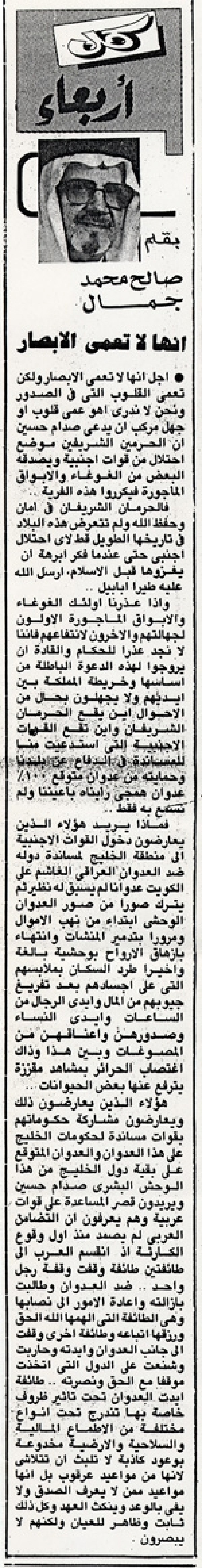 أجل إنها لا تعمي الأبصار ولكن تعمي القلوب التي في الصدور ونحن لا ندري أهو عمى قلوب أو جهل مركب أن يدعي صدام حسين أن الحرمين الشريفين موضع احتلال من قوات أجنبية ويصدقه البعض من الغوغاء والأبواق المأجورة فيكرروا هذه الفرية..