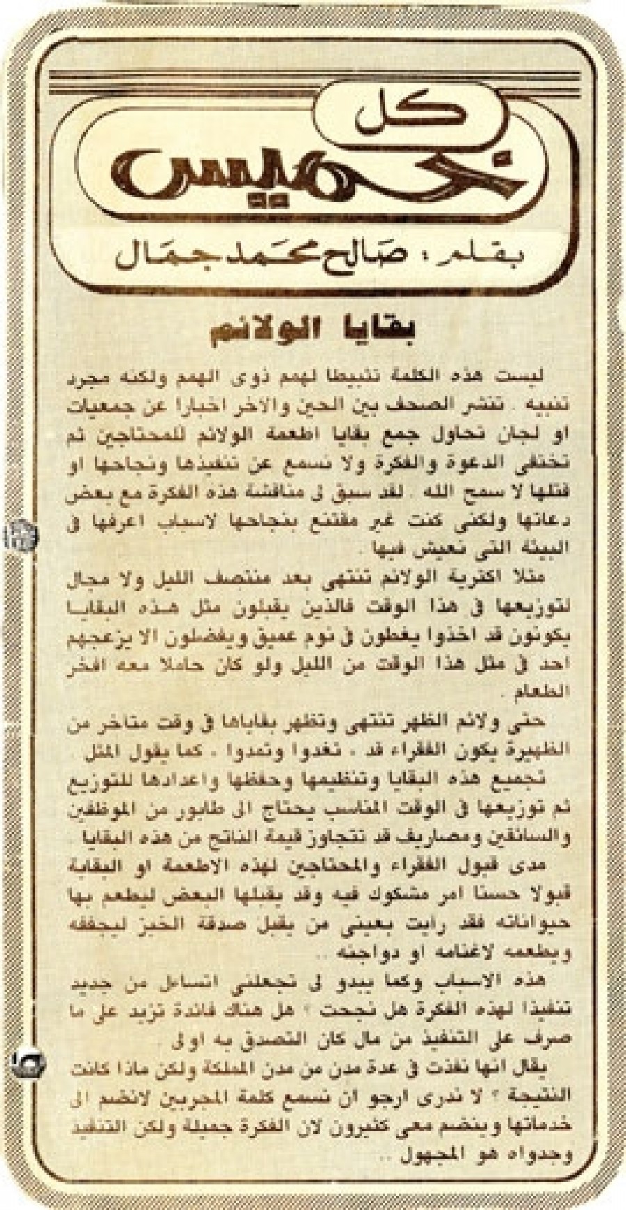 ليست هذه الكلمة تثبيطاً لهمم ذوي الهمم ولكنة مجرد تنبيه. تنشر الصحف بين الحين والآخر أخباراً عن جمعيات أو لجان تحاول جمع بقايا أطعمه الولائم للمحتاجين ثم تختفي الدعوة والفكرة ولا نسمع عن تنفيذها ونجاحها أو قتلها لا سمح الله. لقد سبق لي مناقشة هذه الفكرة مع بعض دعاتها ولكني كنت غير مقتنع بنجاحها لأسباب أعرفها في البيئة التي نعيش فيها.