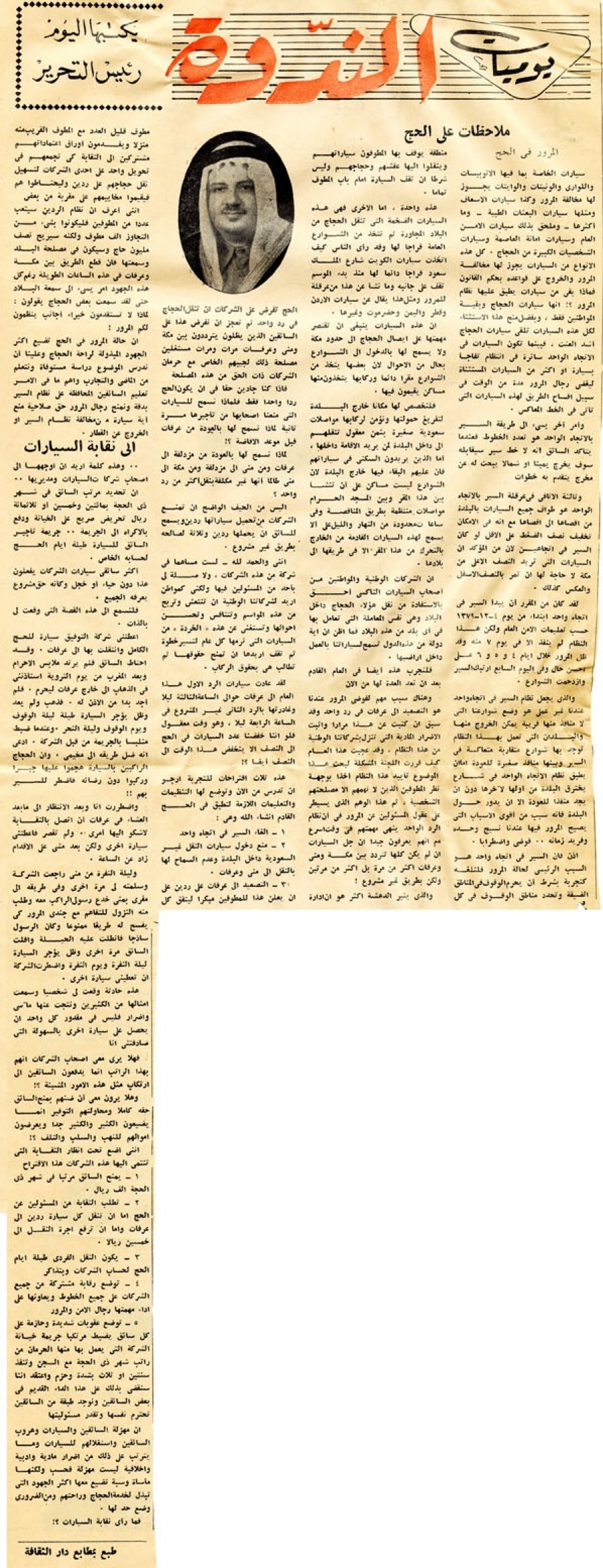 هذه واحدة، أما الأخرى فهي هذه السيارات الضخمة التي تنقل الحجاج من البلاد المجاورة ثم تتخذ من الشوارع العامة قراجاً لها وقد رأى الناس كيف اتخذت سيارات الكويت شارع الملك سعود قراجاً دائماً لها منذ بدء الموسم تقف على جانبه وما نشأ عن هذا من عرقلة للمرور ومثل هذا يقال عن سيارات الأردن وقطر واليمن وحضرموت وغيرها.