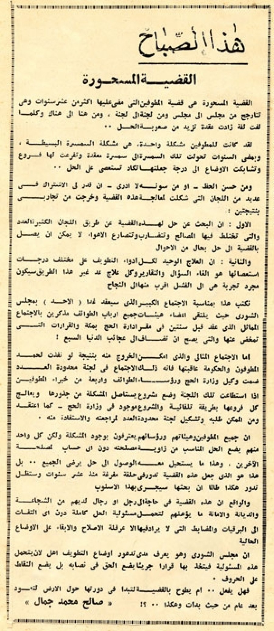أما الاجتماع المثالي والذي أمكن الخروج منه بنتيجة لو نفذت لحمد المطوفون والحكومة عاقبتها فإنه ذلك الاجتماع في لجنة محدودة العدد ضمت وكيل وزارة الحج ورؤساء الطوائف وأربعة من خبراء المطوفين إذ استطاعت تلك اللجنة وضع مشروع يستأصل المشكلة من جذورها، ويعالج كل فروعها بطريقة تلقائية والمشروع موجود في وزارة الحج – كما أعتقد ومن الممكن طلبه وتشكيل لجنة محدودة العدد لمراجعته والاستفادة منه.