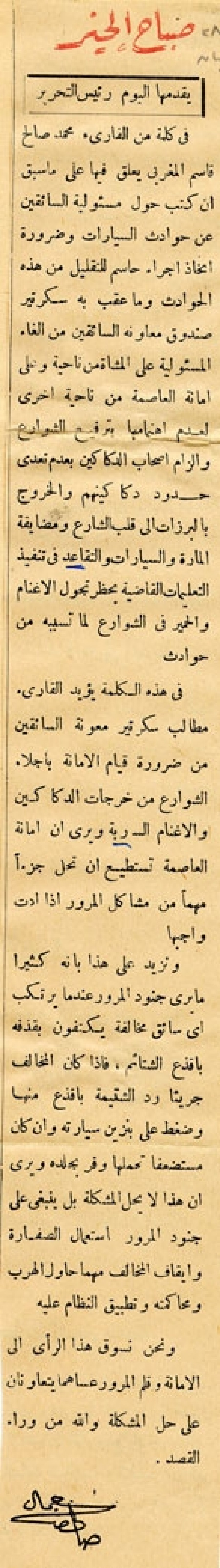 في كلمة من القارئ محمد صالح قاسم المغربي يعلق فيها على ما سبق أن كتب حول مسئولية السائقين عن حوادث السيارات وضرورة اتخاذ إجراء حاسم للتقليل من هذه الحوادث وما عقب به سكرتير صندوق معاونة السائقين من إلغاء المسئولية على المشاة من ناحية وعلى أمانة العاصمة من ناحية أخرى لعدم اهتمامها بترقيع الشوارع وإلزام أصحاب الدكاكين بعدم تعدي حدود دكاكينهم والخروج بالبرزات إلى قلب الشارع ومضايفة المارة والسيارات والتقاعس في تنفيذ التعليمات القاضية بحظر تجول الأغنام والحمير في الشوارع لما تسببه من حوادث.