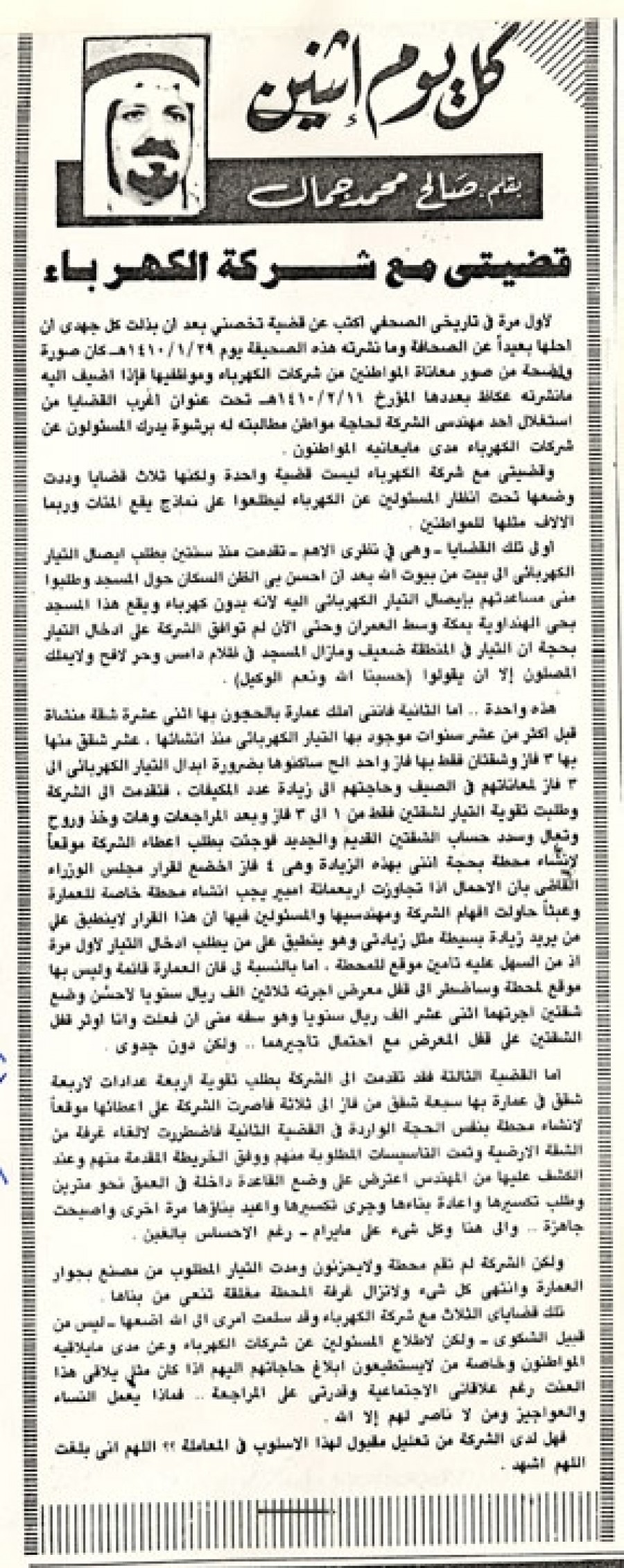 لأول مرة في تاريخي الصحفي أكتب عن قضية تخصني بعد أن بذلت كل جهدي أن أحلها بعيداً عن الصحافة وما نشرته هذه الصحيفة يوم 29/1/1410 ﻫ كان صورة واضحة من صورة معاناة المواطنين من شركات الكهرباء وموظفيها فإذا أضيف إليه ما نشرته عكاظ بعددها المؤرخ 11/2/1410 ﻫ تحت عنوان أغرب القضايا من استغلال أحد مهندسي الشركة لحاجة مواطن مطالبته له برشوة يدرك المسئولون عن شركات الكهرباء مدي ما يعانيه المواطنون.