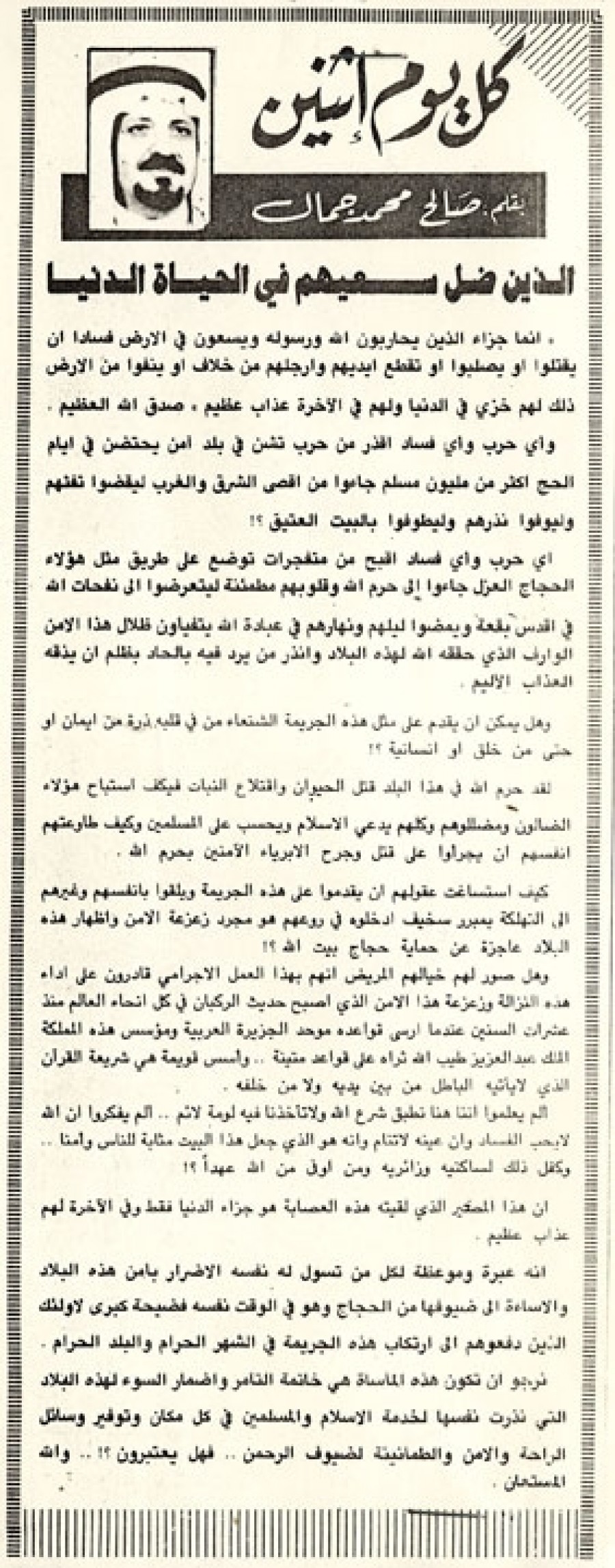 أي حرب وأي فساد أقبح من متفجرات توضع على طريق مثل هؤلاء الحجاج العزل جاءوا إلي حرم الله وقلوبهم مطمئنة ليتعرضوا إلي نفحات الله في أقدس بقعة ويمضوا ليلهم ونهارهم في عبادة الله يتفيأون ظلال هذا الأمن الوارف الذي حققه الله لهذه البلاد وأنذر من يرد فيه بالحاد بظلم أن يذقه العذاب الأليم.