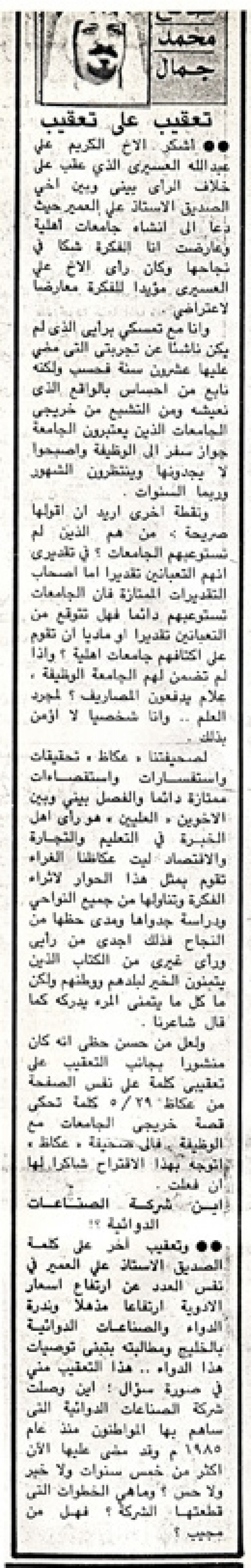 وتعقيب آخر على كلمة الصديق الأستاذ علي العمير في نفس العدد عن ارتفاع أسعار الأدوية ارتفاعا مذهلا وندرة الدواء والصناعات الدوائية بالخليج ومطالبته بتبني توصيات هذا الدواء.. هذا التعقيب مني في صورة سؤال؛ أين وصلت شركة الصناعات الدوائية التي ساهم بها المواطنون منذ عام 1985 م وقد مضى عليها الآن أكثر من خمس سنوات ولا خبر ولا حس؟ وما هي الخطوات التي قطعتها الشركة؟ فهل من مجيب؟