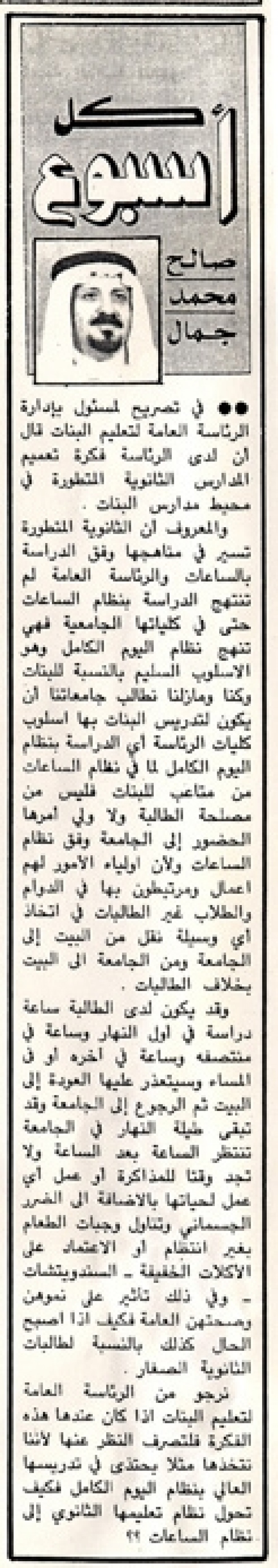نرجو من الرئاسة العامة لتعليم البنات إذا كان عندها هذه الفكرة فلتصرف النظر عنها لأننا نتخذها مثلا يحتذي به في تدريسها العالي بنظام اليوم الكامل فكيف تحول نظام تعليمها الثانوي إلى نظام الساعات؟؟