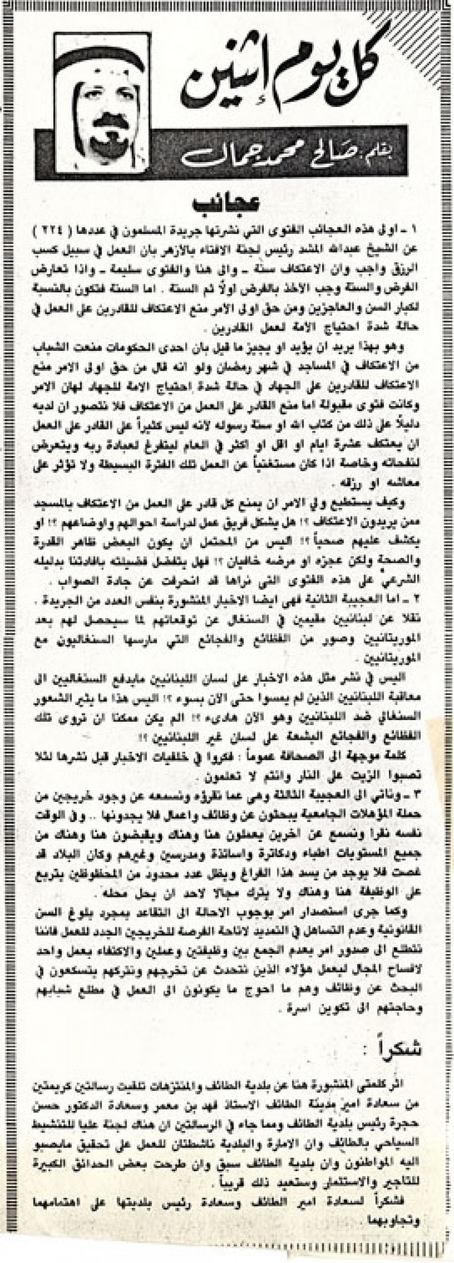 1- أولى هذه العجائب الفتوى التي نشرتها جريدة المسلمون في عددها (224) عن الشيخ عبد الله المشد رئيس لجنة الإفتاء بالأزهر بأن العمل في سبيل كسب الرزق واجب وأن الاعتكاف سنة – وإلى هنا والفتوى سليمة – واذا تعارض الفرض والسنة وجب الأخذ بالفرض أولاً ثم السنة. أما السنة. أما السنة فتكون بالنسبة لكبار السن والعاجزين ومن حق أولى الأمر منع الاعتكاف للقادرين على العمل في حالة شدة احتياج الأمة لعمل القادرين.